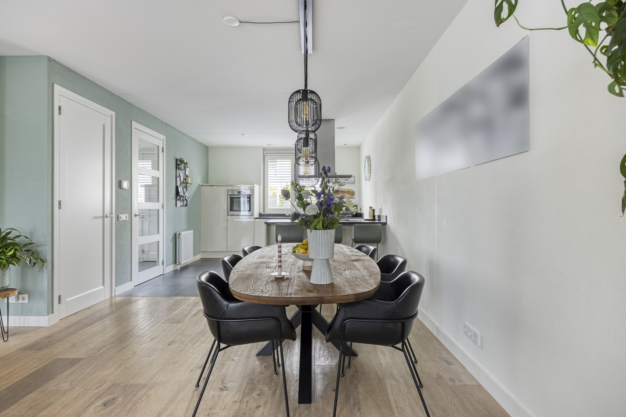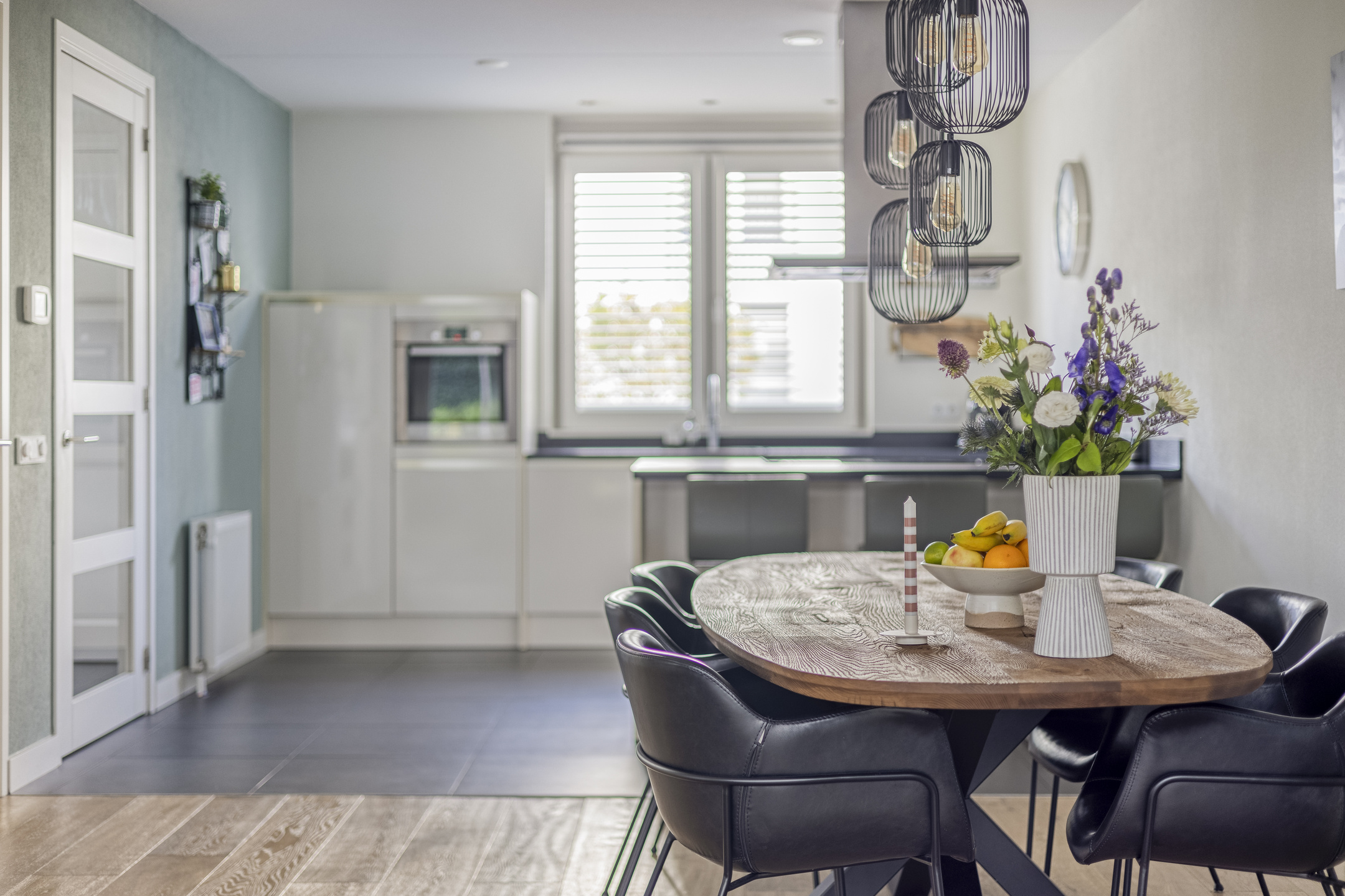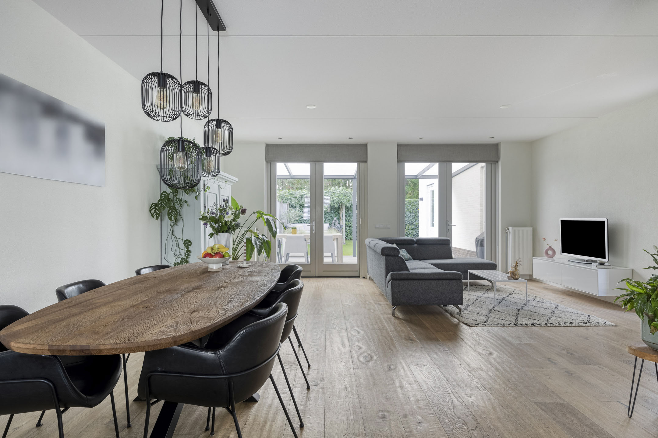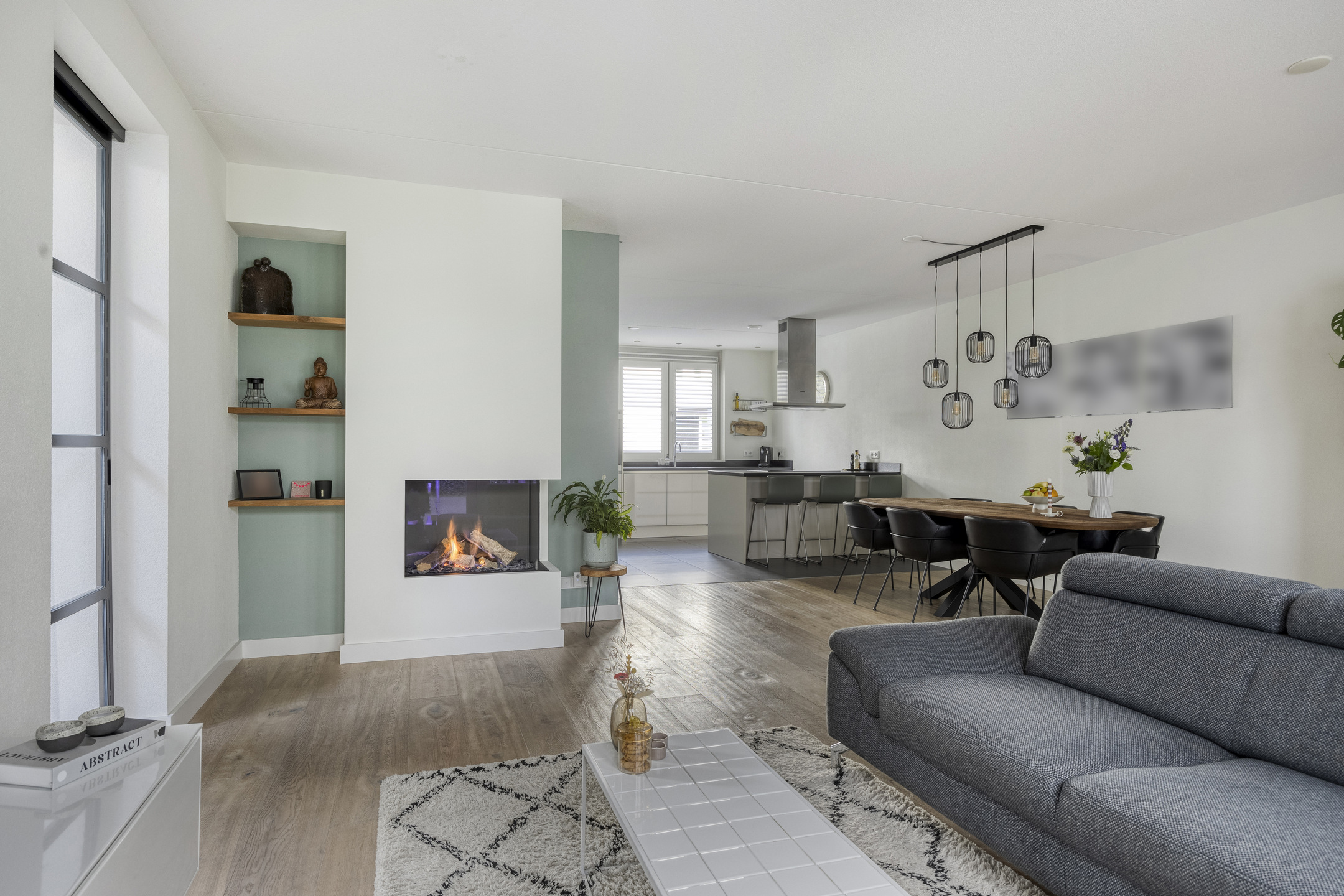 De woonkamer voelt direct ruim en licht aan, dankzij de grote ramen aan de voorzijde en de dubbele openslaande deuren naar de tuin. De houten vloer geeft warmte en sfeer, en er is meer dan genoeg plek voor een grote eettafel. Rondom de haard kun je bovendien een gezellige zithoek creëren. De woonkamer is opgezet in een L-vorm, waarbij de keuken aan de voorzijde is geplaatst.