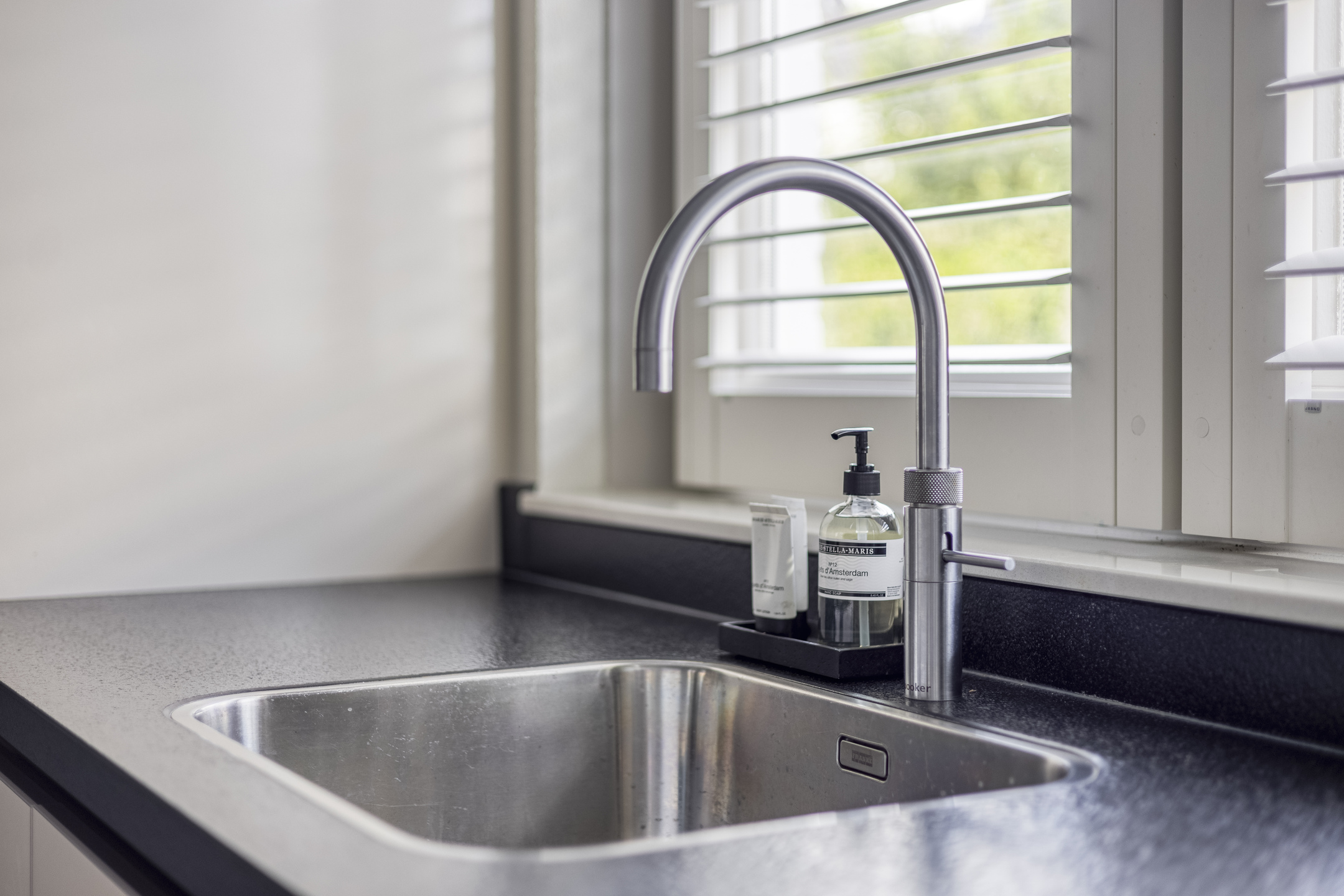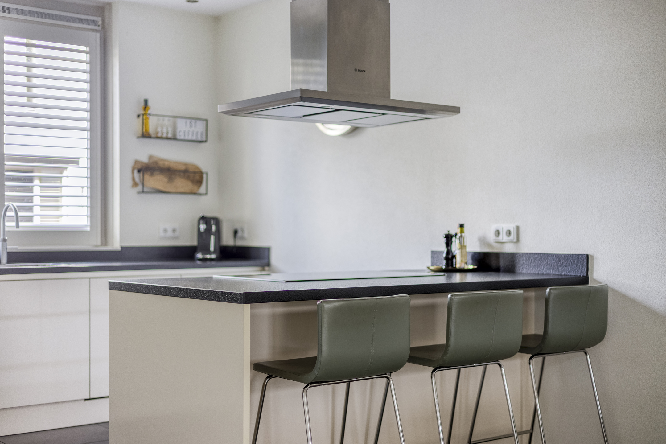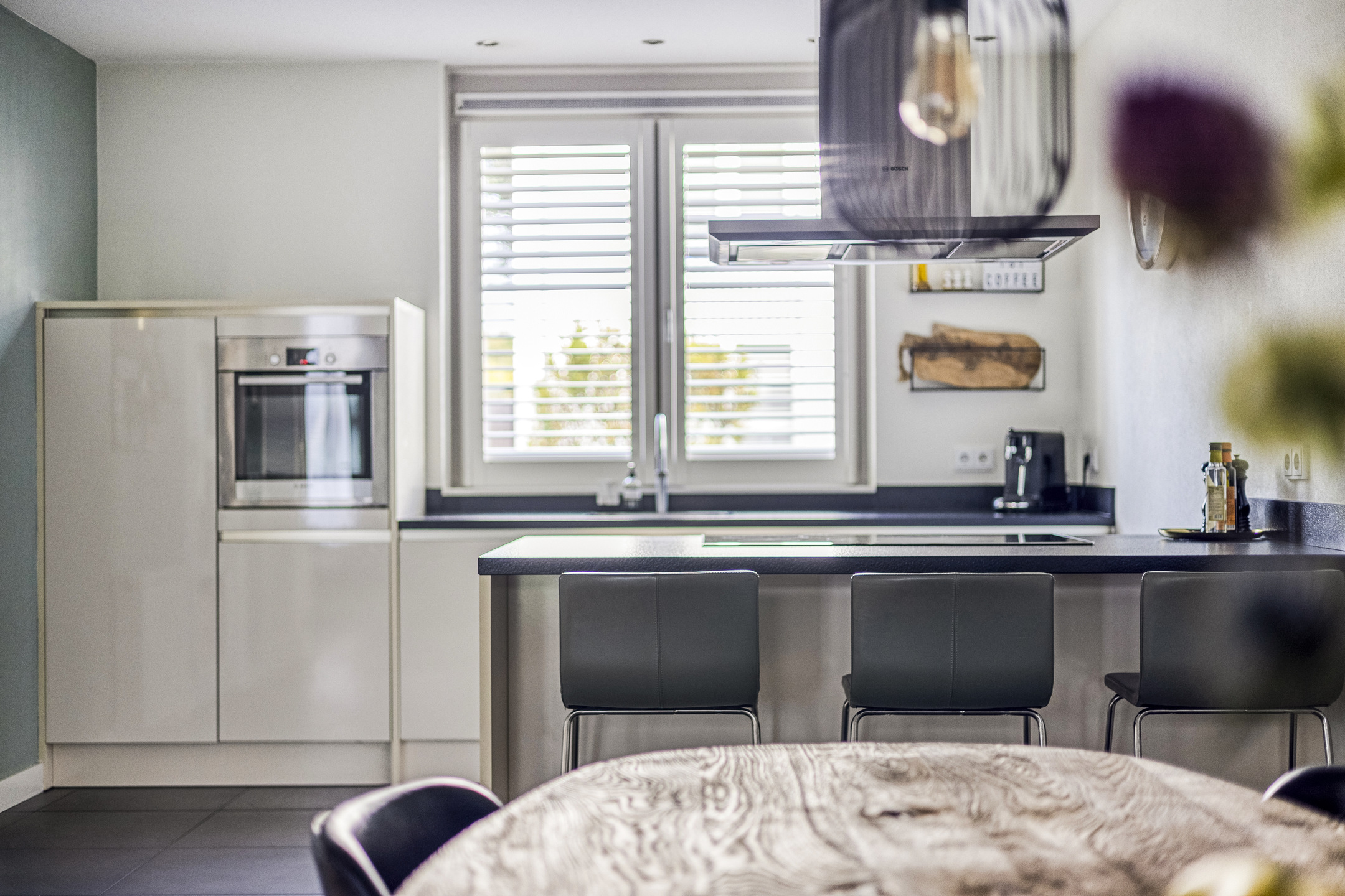 De keuken is modern, licht en praktisch. Je kookt hier op een inductieplaat ingebouwd in het grote kookeiland. In de ruime lades heb je volop bergruimte en aan de andere kant van het eiland kun je aan het barretje plaatsnemen. In de wandopstelling vind je de spoelbak met Quooker, een vaatwasser en een grote koelkast. Dankzij de donkergrijze tegelvloer met vloerverwarming en het mooie lichtinval door de ramen met shutters is dit een plek waar je graag kookt én samenkomt.