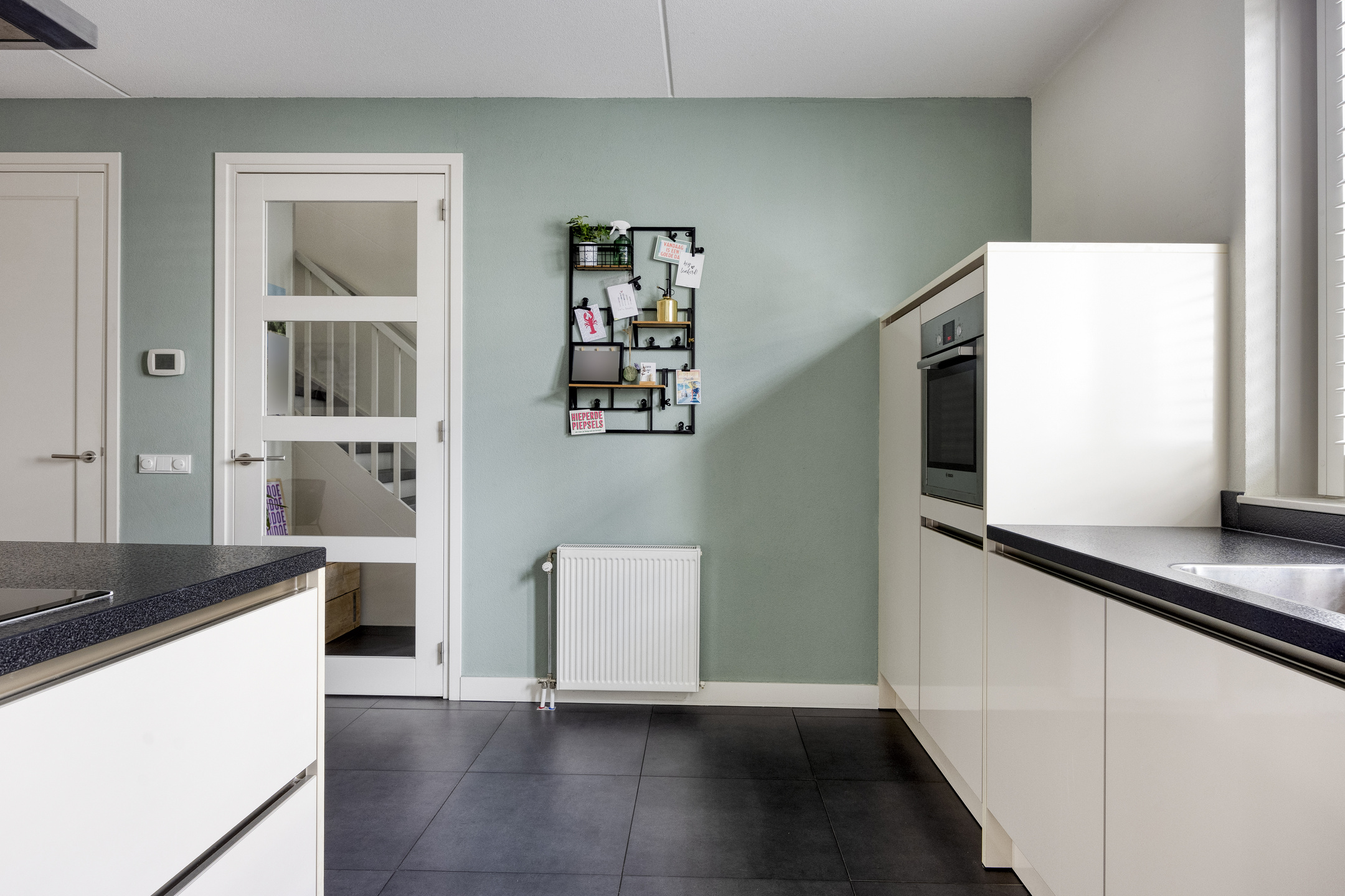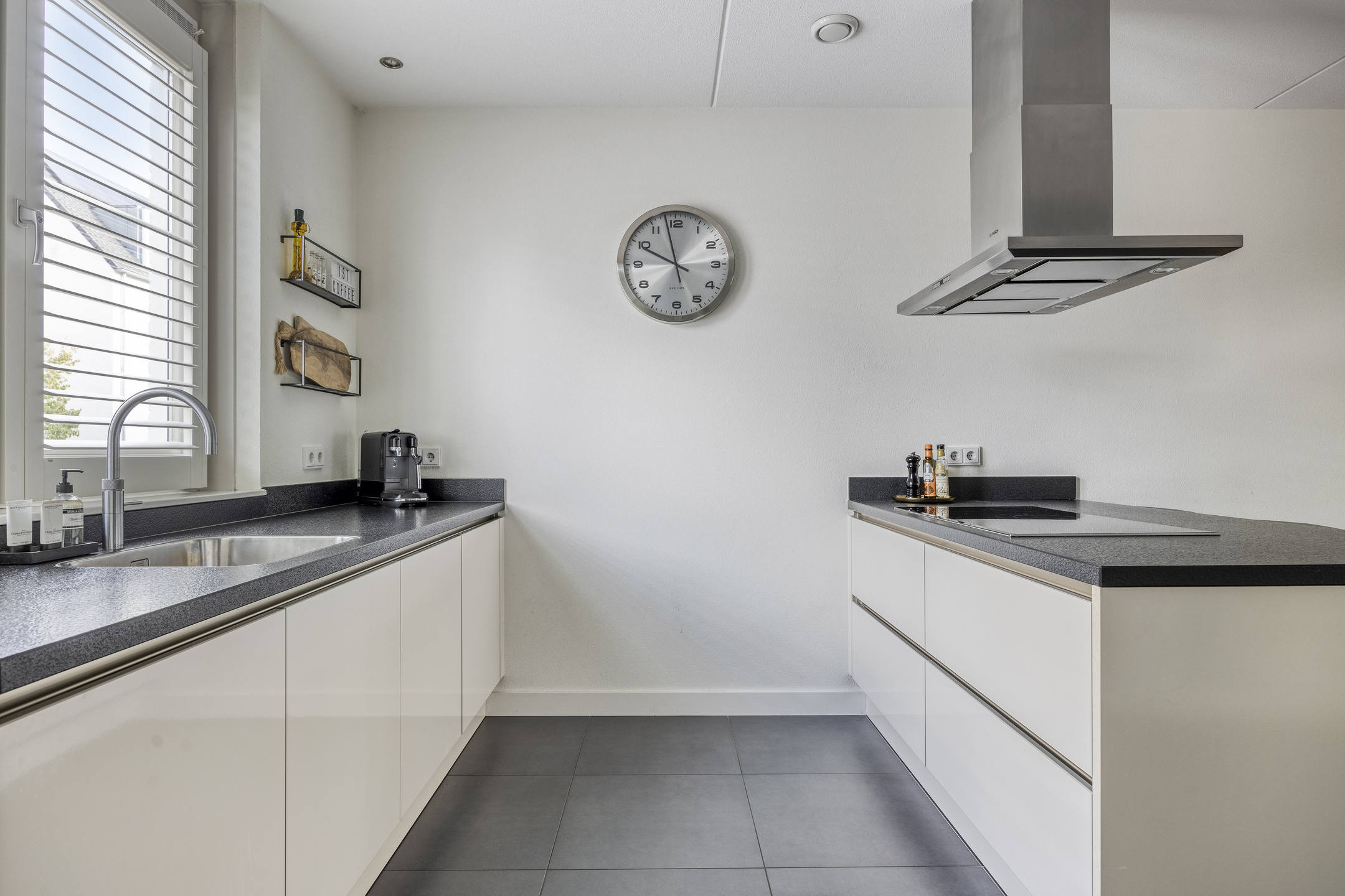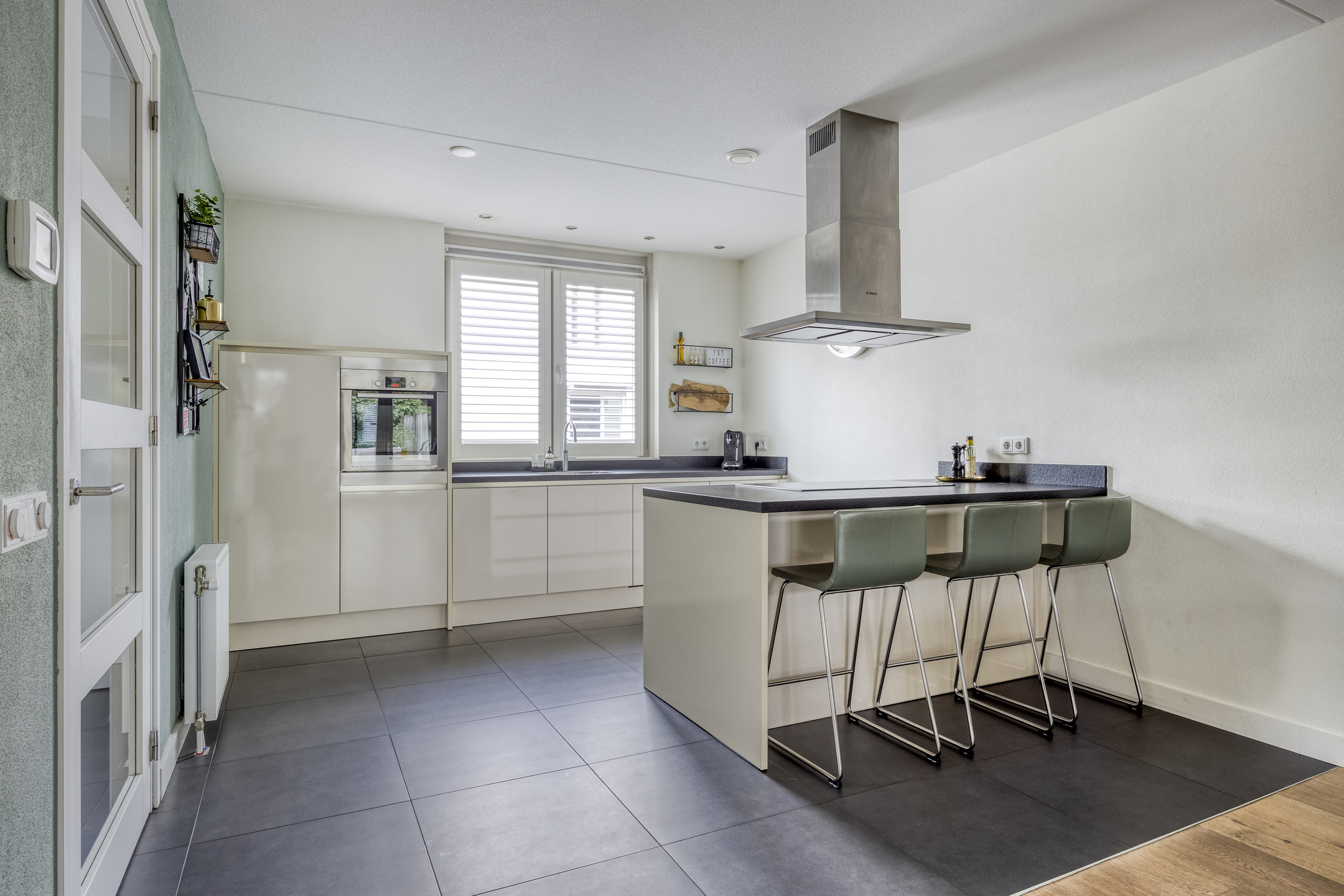 De keuken is modern, licht en praktisch. Je kookt hier op een inductieplaat ingebouwd in het grote kookeiland. In de ruime lades heb je volop bergruimte en aan de andere kant van het eiland kun je aan het barretje plaatsnemen. In de wandopstelling vind je de spoelbak met Quooker, een vaatwasser en een grote koelkast. Dankzij de donkergrijze tegelvloer met vloerverwarming en het mooie lichtinval door de ramen met shutters is dit een plek waar je graag kookt én samenkomt.
