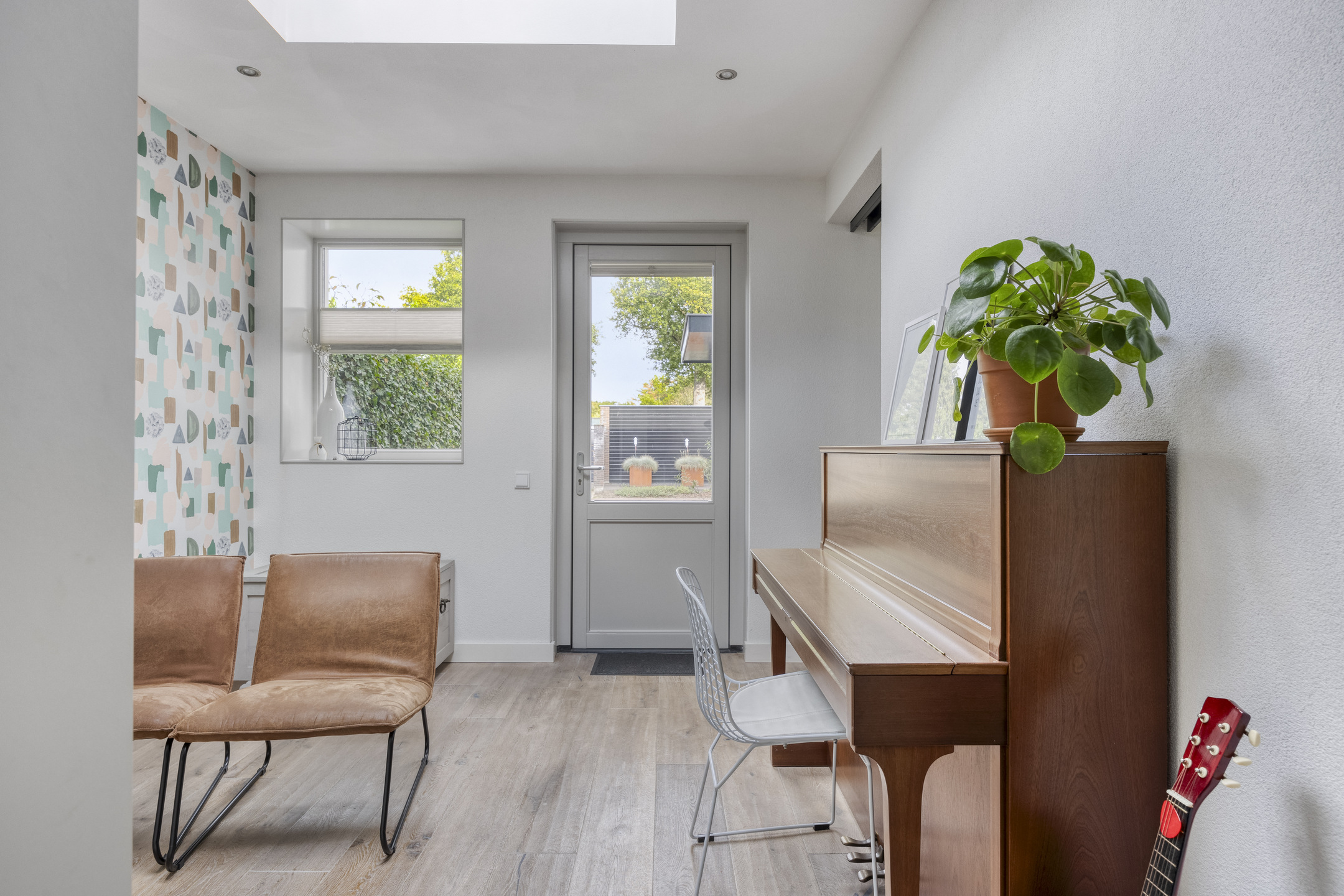 Vanuit de woonkamer heb je toegang tot een extra kamer in de aanbouw, afgesloten met een stijlvolle stalen deur met glas. Deze ruimte is heerlijk licht door de ramen, een loopdeur naar de oprit en de grote lichtkoepel. Of je deze kamer nu gebruikt als speelkamer, tv-kamer, werkplek of hobbyruimte: het is een fijne toevoeging aan het huis.