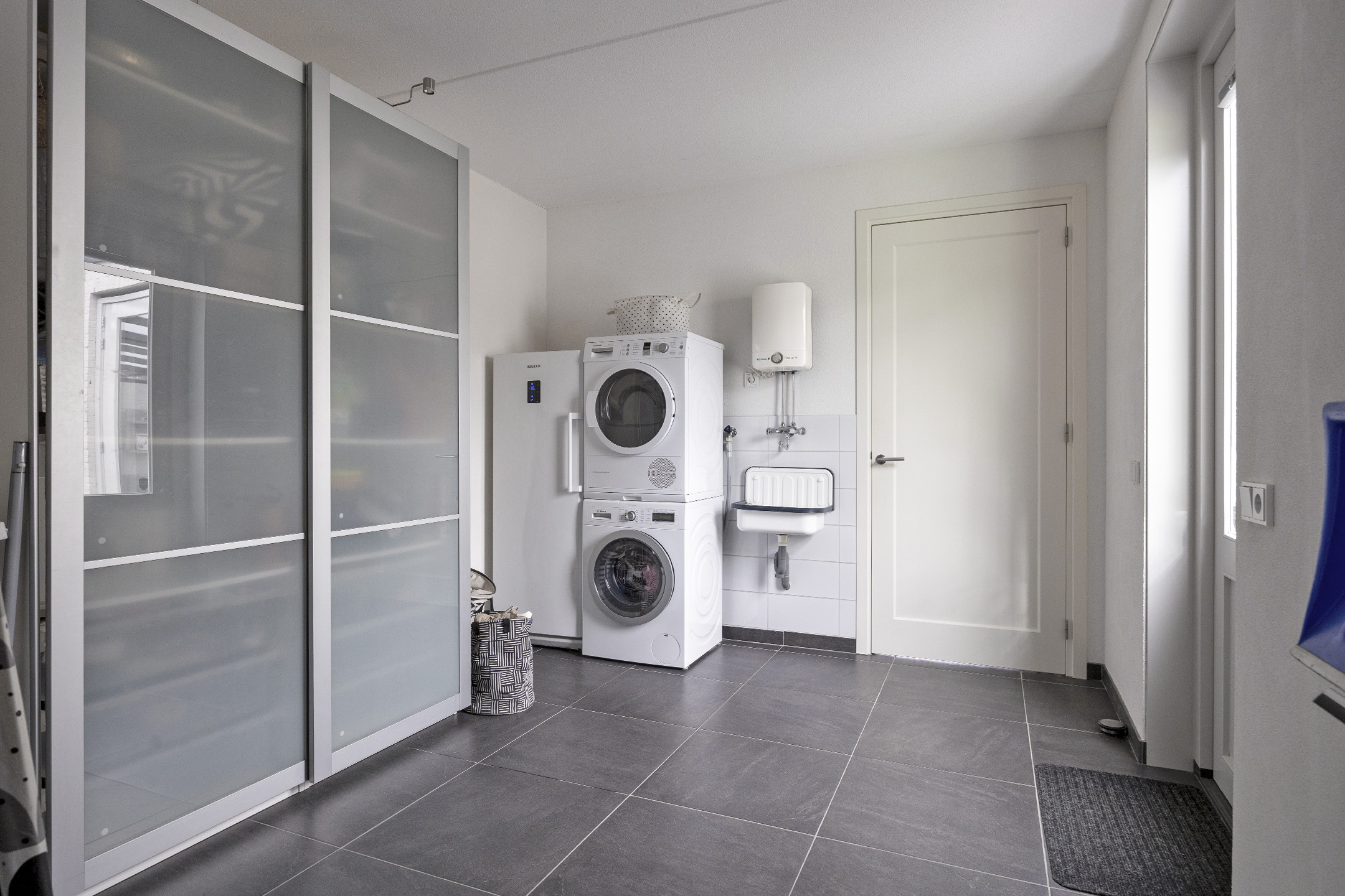 Vanuit deze kamer bereik je ook de bijkeuken/berging, waar de aansluitingen voor wasmachine en droger zijn en volop ruimte is voor extra opslag. Dankzij de toegangsdeuren naar de achtertuin is dit een praktische plek voor fietsen of tuingereedschap.