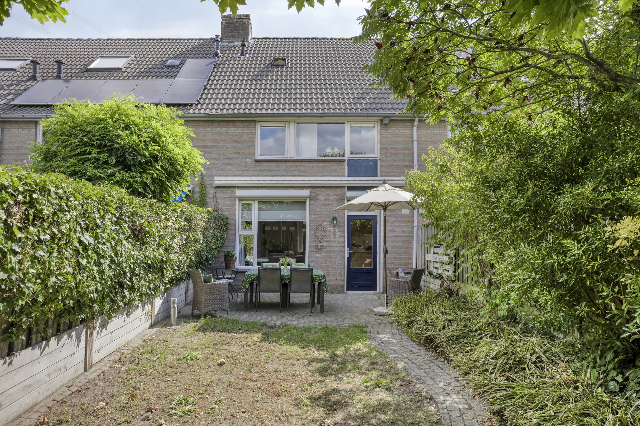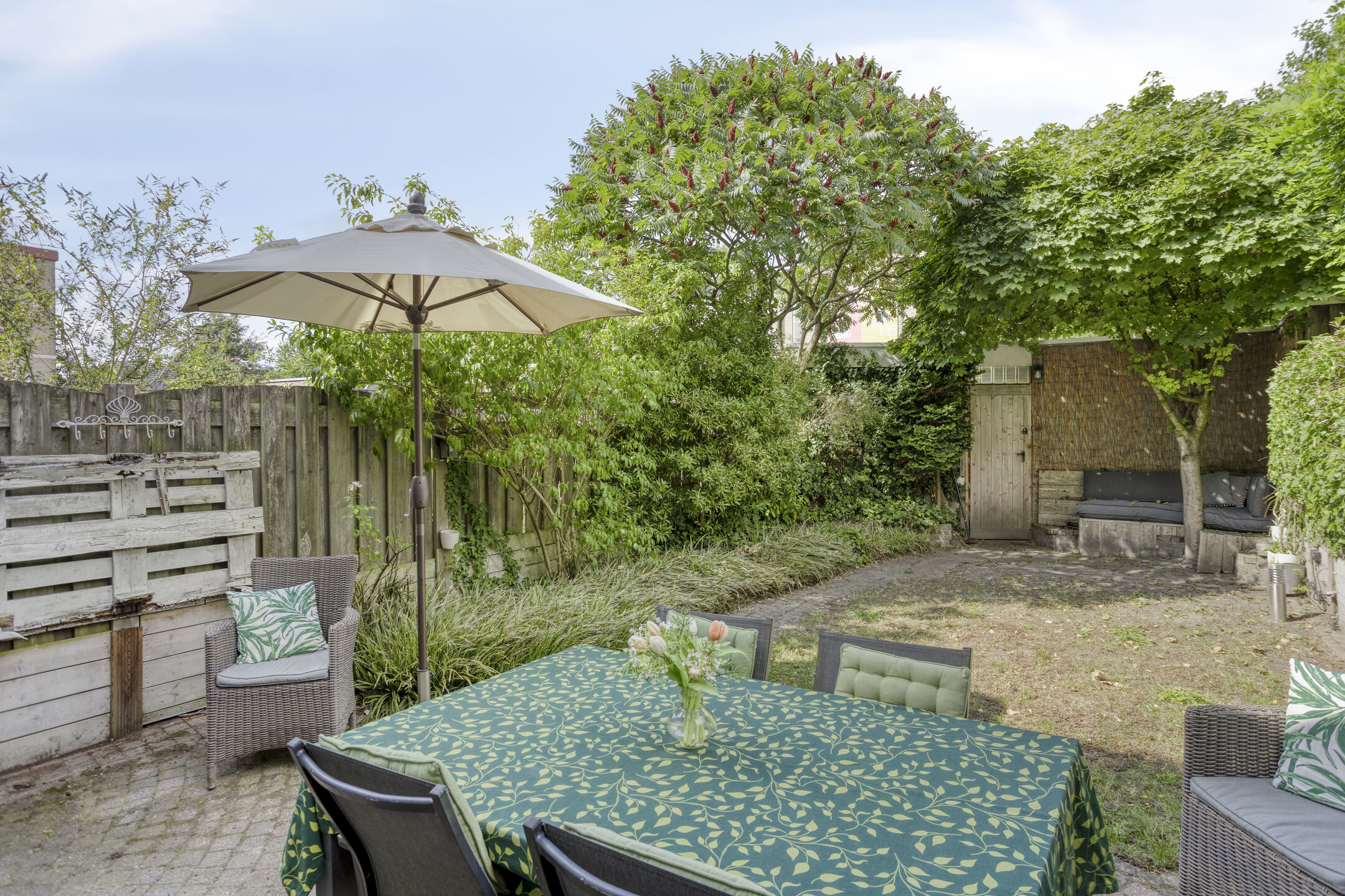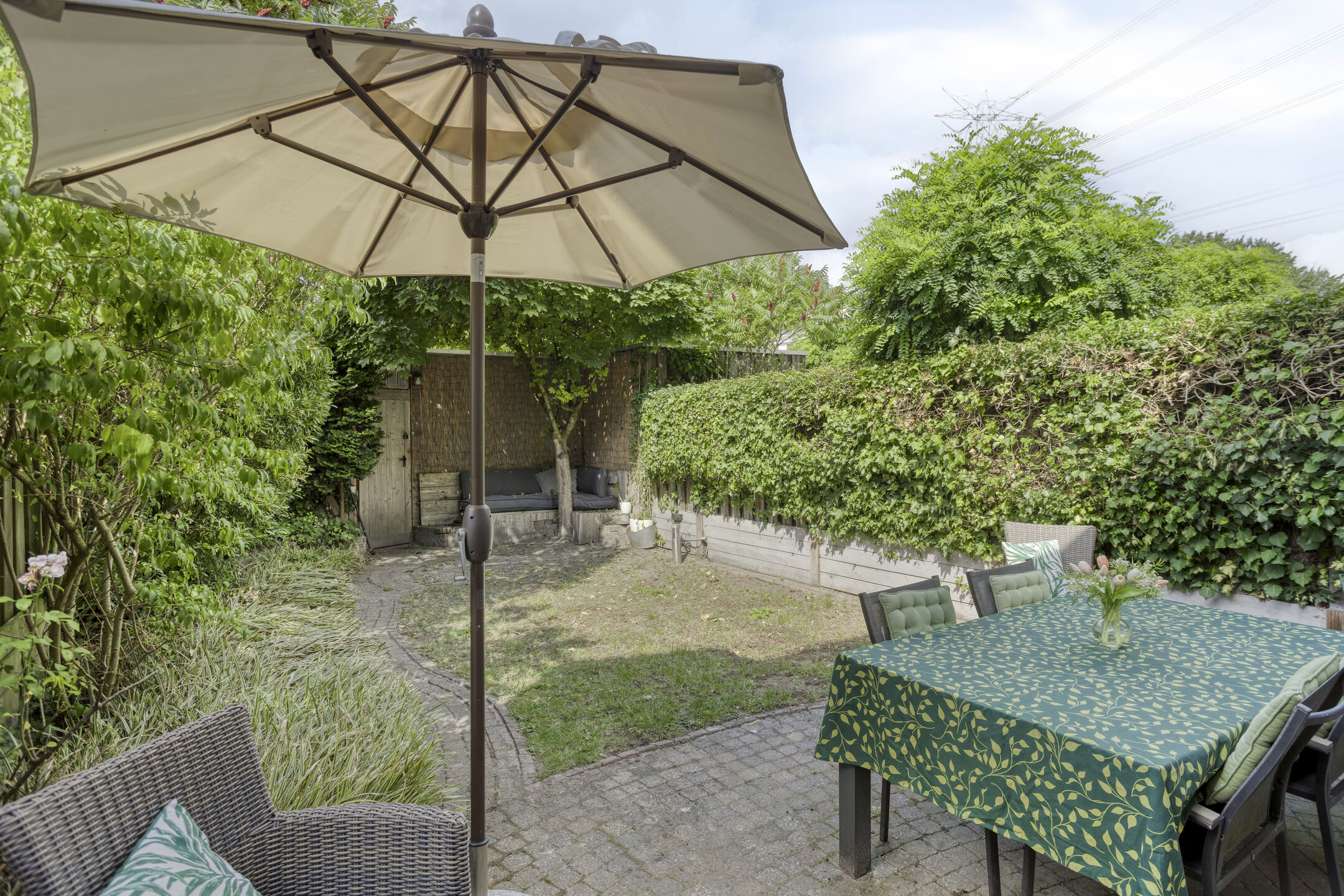 Achter de woning ligt een breed terras met zonneluifel, aansluitend op een grasveldje. Een pad leidt naar de ruime berging, ideaal voor fietsen, tuingereedschap en speelgoed. Via de poort is er achterom toegang.
