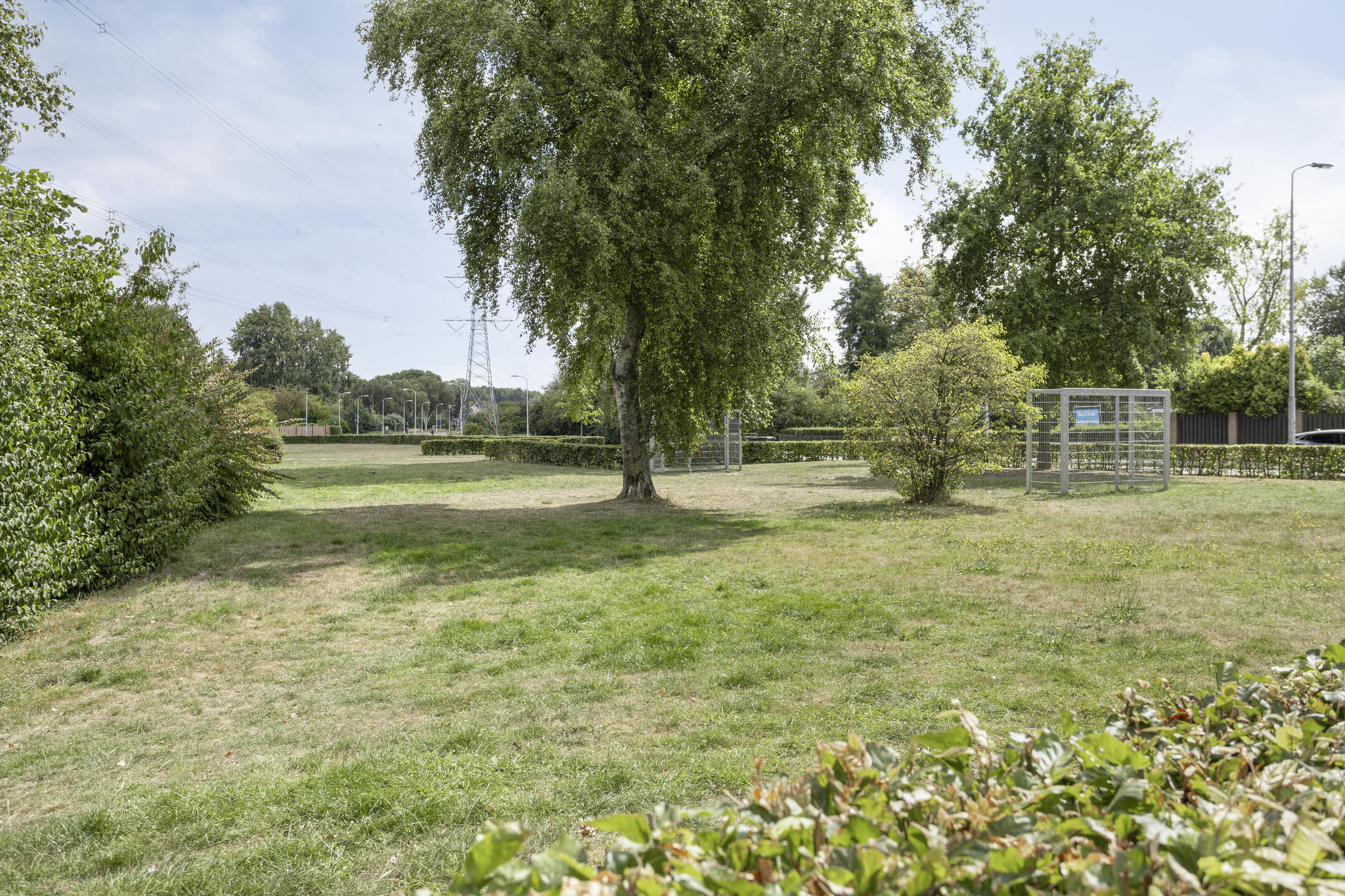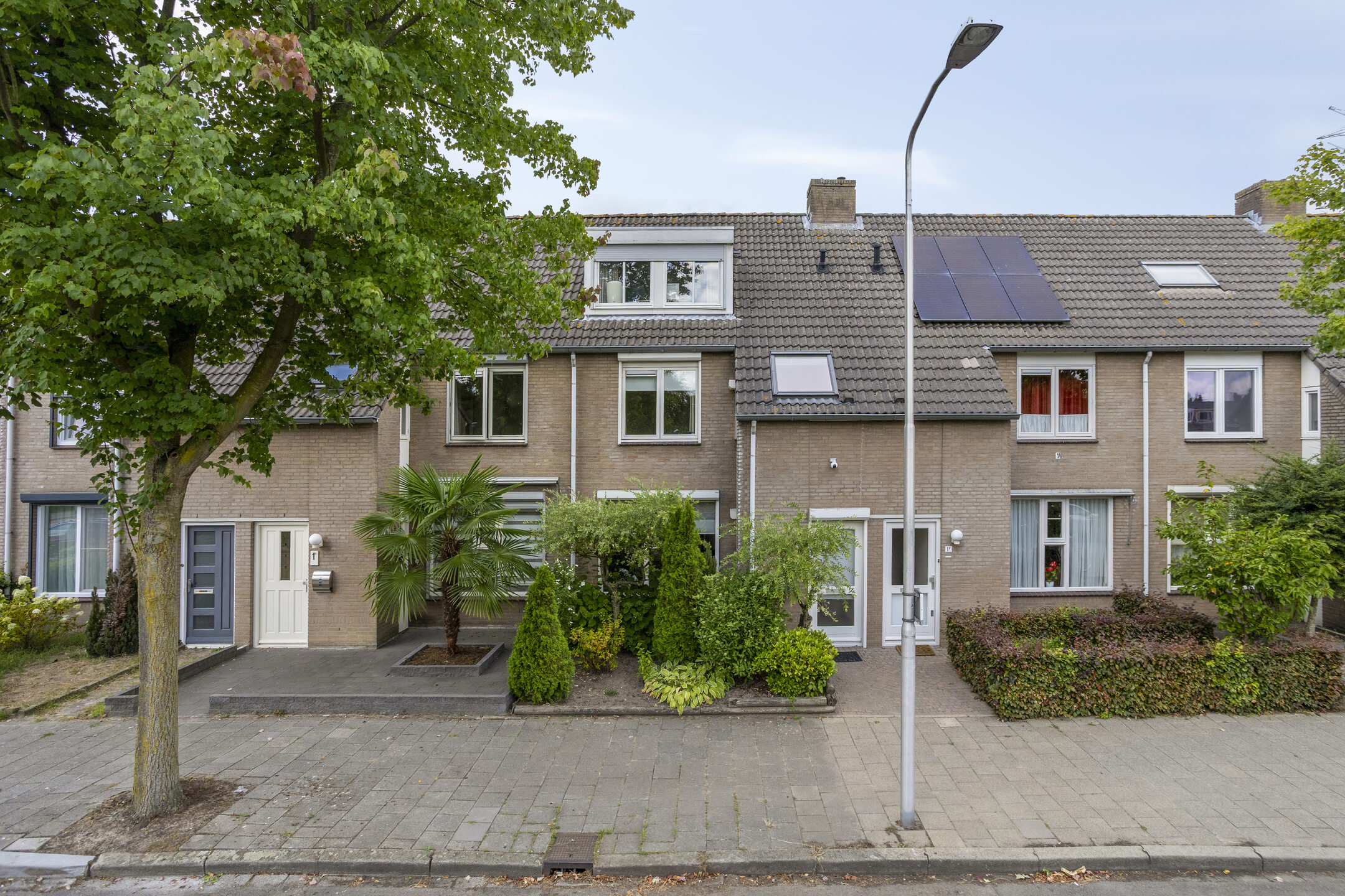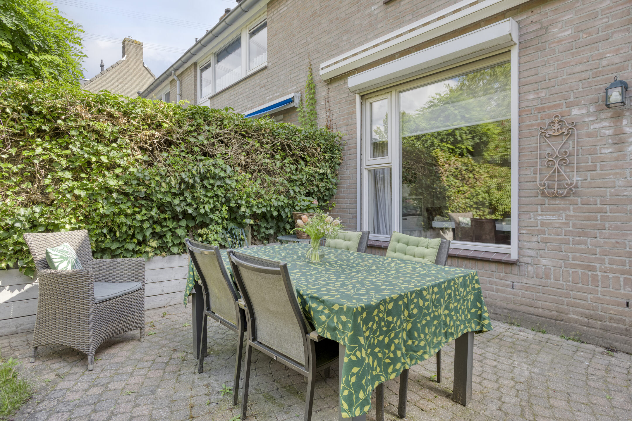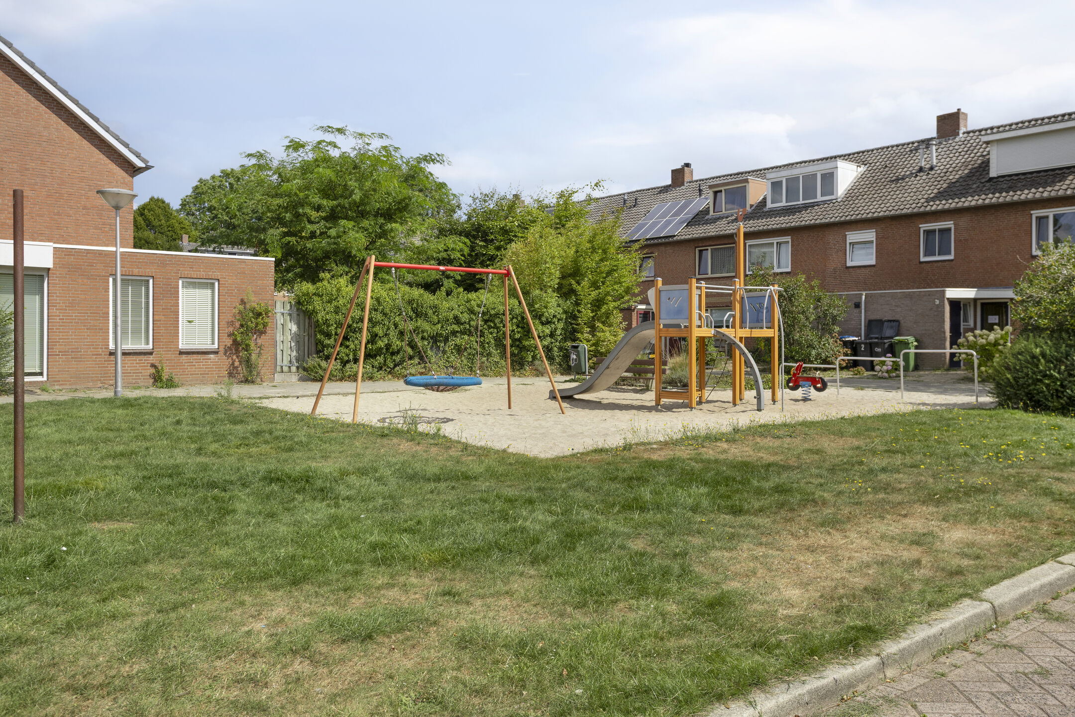 Achter de woning ligt een breed terras met zonneluifel, aansluitend op een grasveldje. Een pad leidt naar de ruime berging, ideaal voor fietsen, tuingereedschap en speelgoed. Via de poort is er achterom toegang.