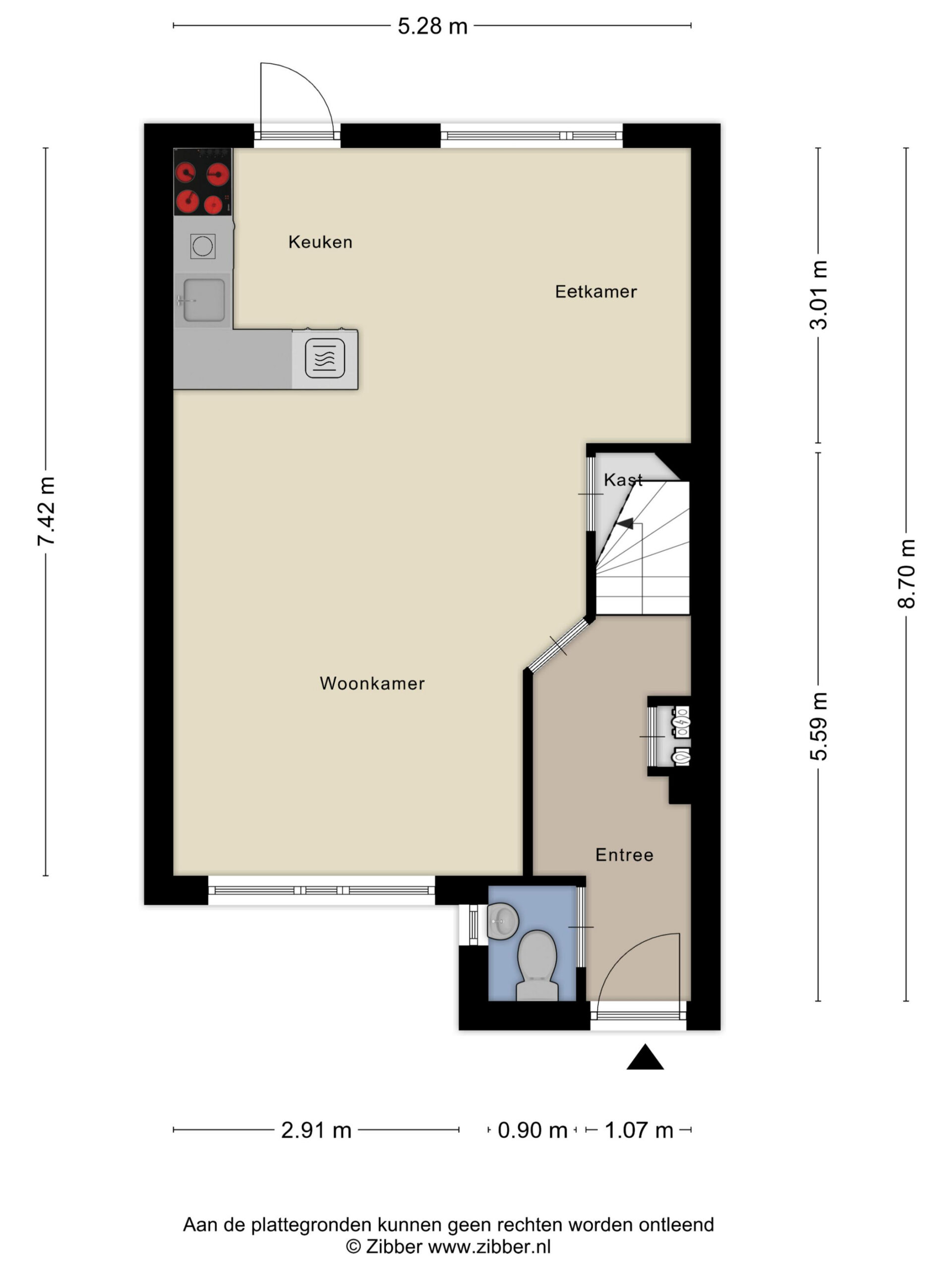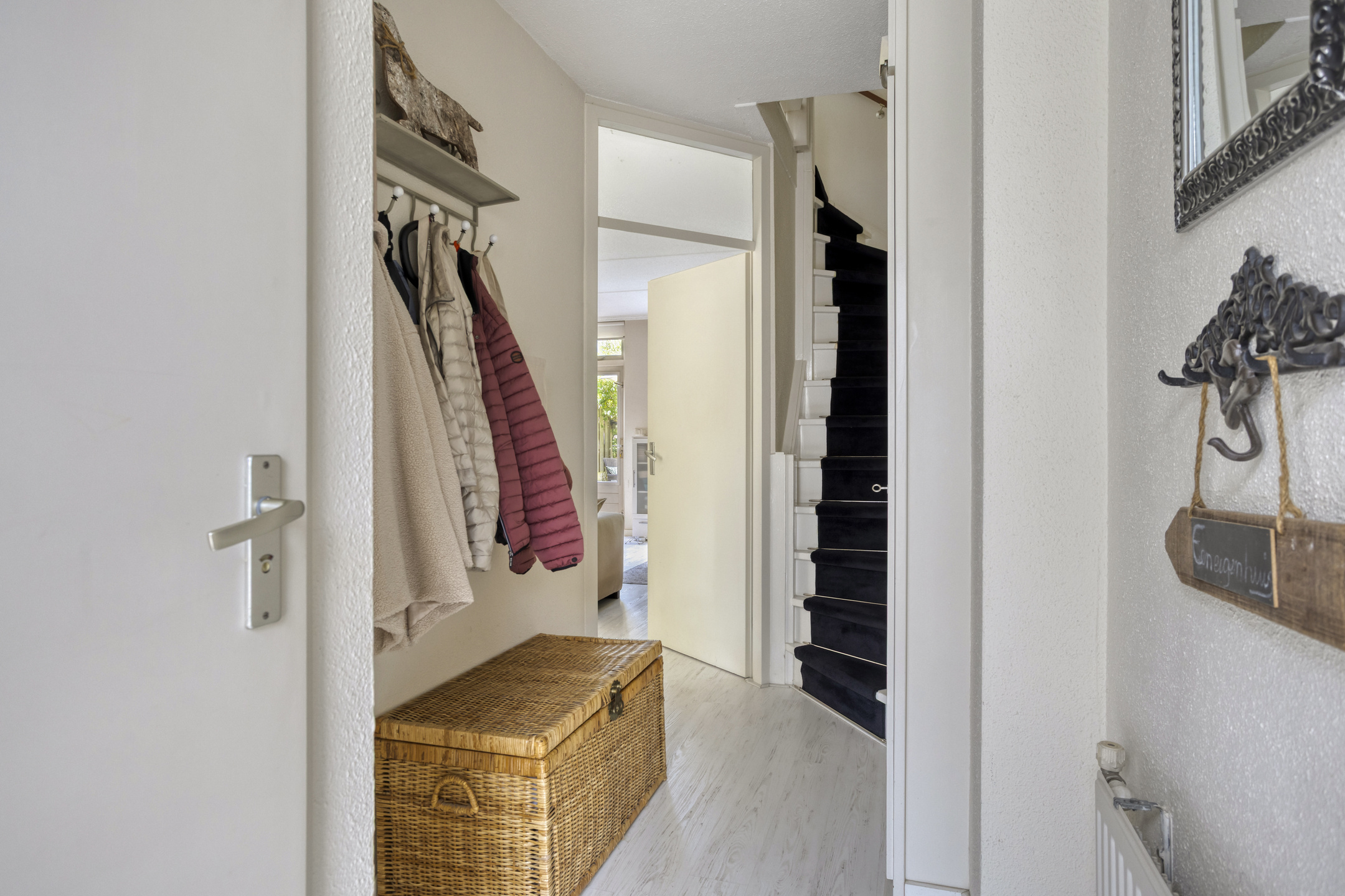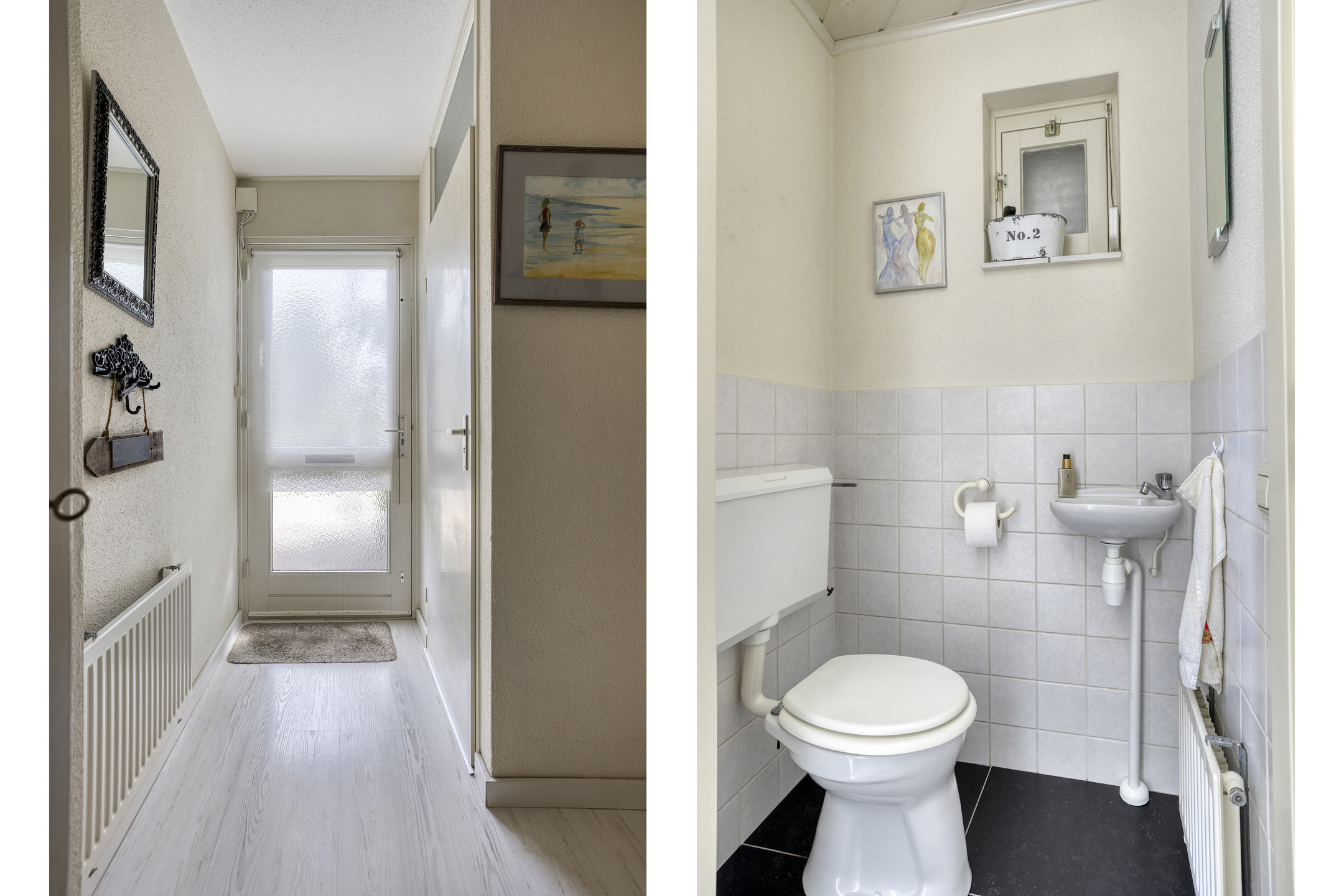Via de verzorgde voortuin bereik je de voordeur. In de hal bevinden zich de meterkast, de trapopgang en het toilet. De halfbetegelde toiletruimte beschikt over een staand closet, fonteintje en een raam voor natuurlijke licht- en luchttoevoer. De lichte laminaatvloer loopt vanuit de entree door in de gehele leefruimte en zorgt voor een warm en harmonieus geheel.