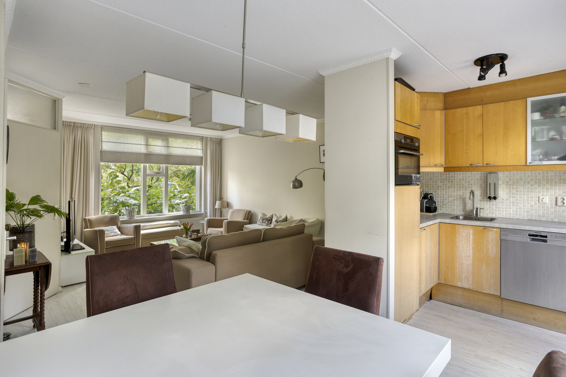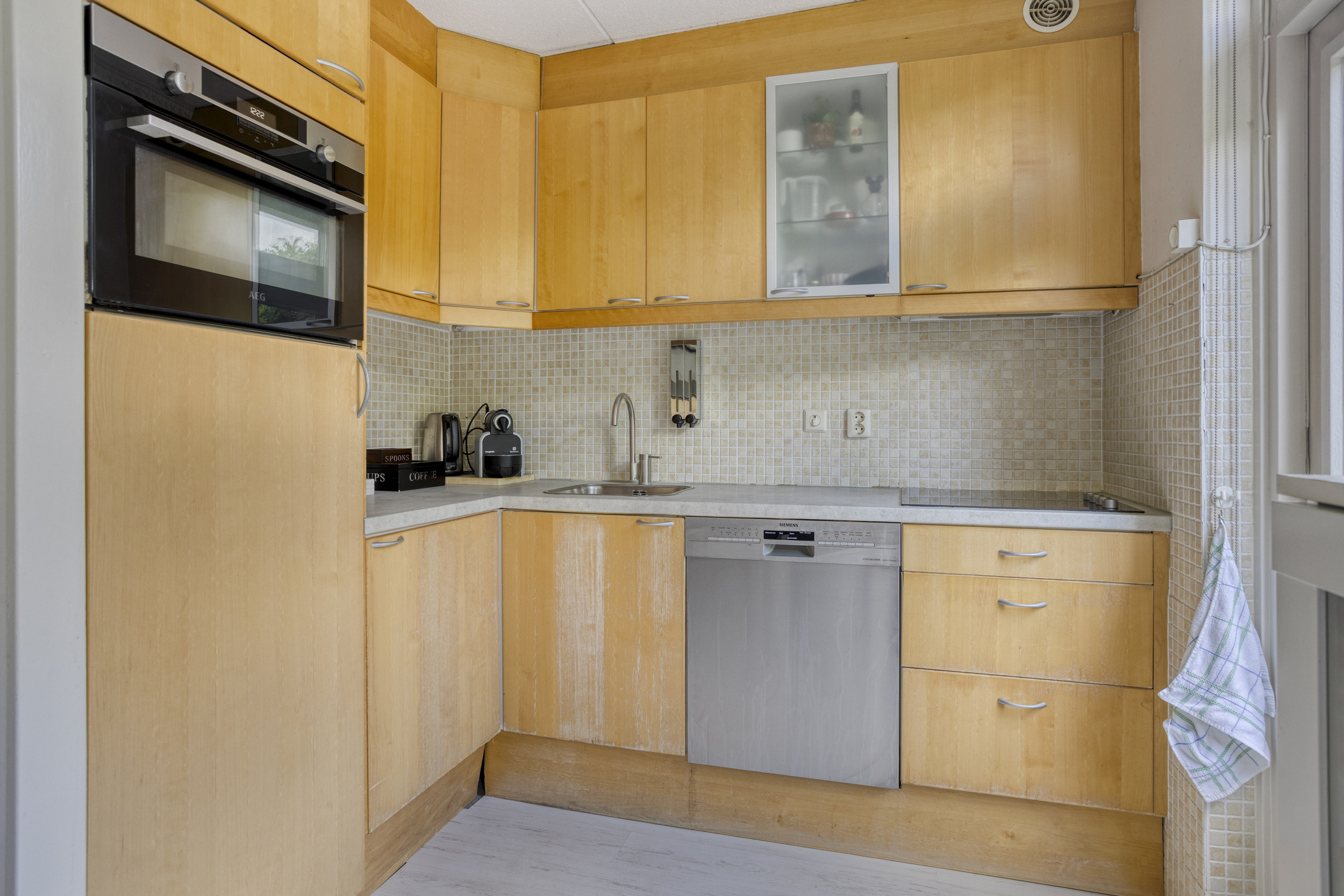 De keuken is voorzien van een kunststof werkblad, betegelde achterwand en bovenkasten met veel opbergruimte. Verder is deze uitgerust met een keramische kookplaat, combimagnetron, vaatwasser en koelkast.