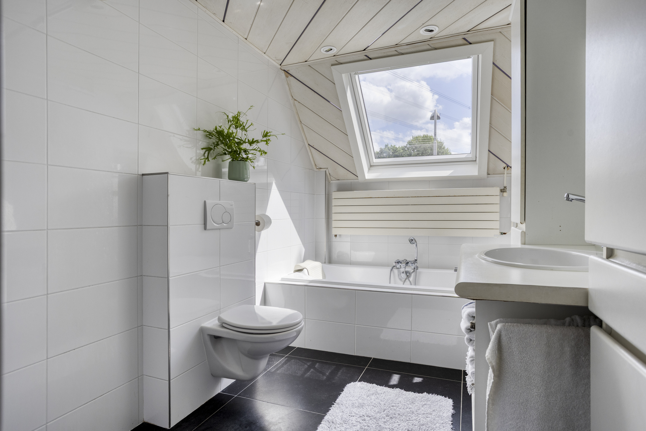 De volledig betegelde badkamer is uitgerust met een toilet, wastafelmeubel, douche, ligbad en designradiator. Het dak- en zijraam zorgen hier voor daglicht en natuurlijke ventilatie.
