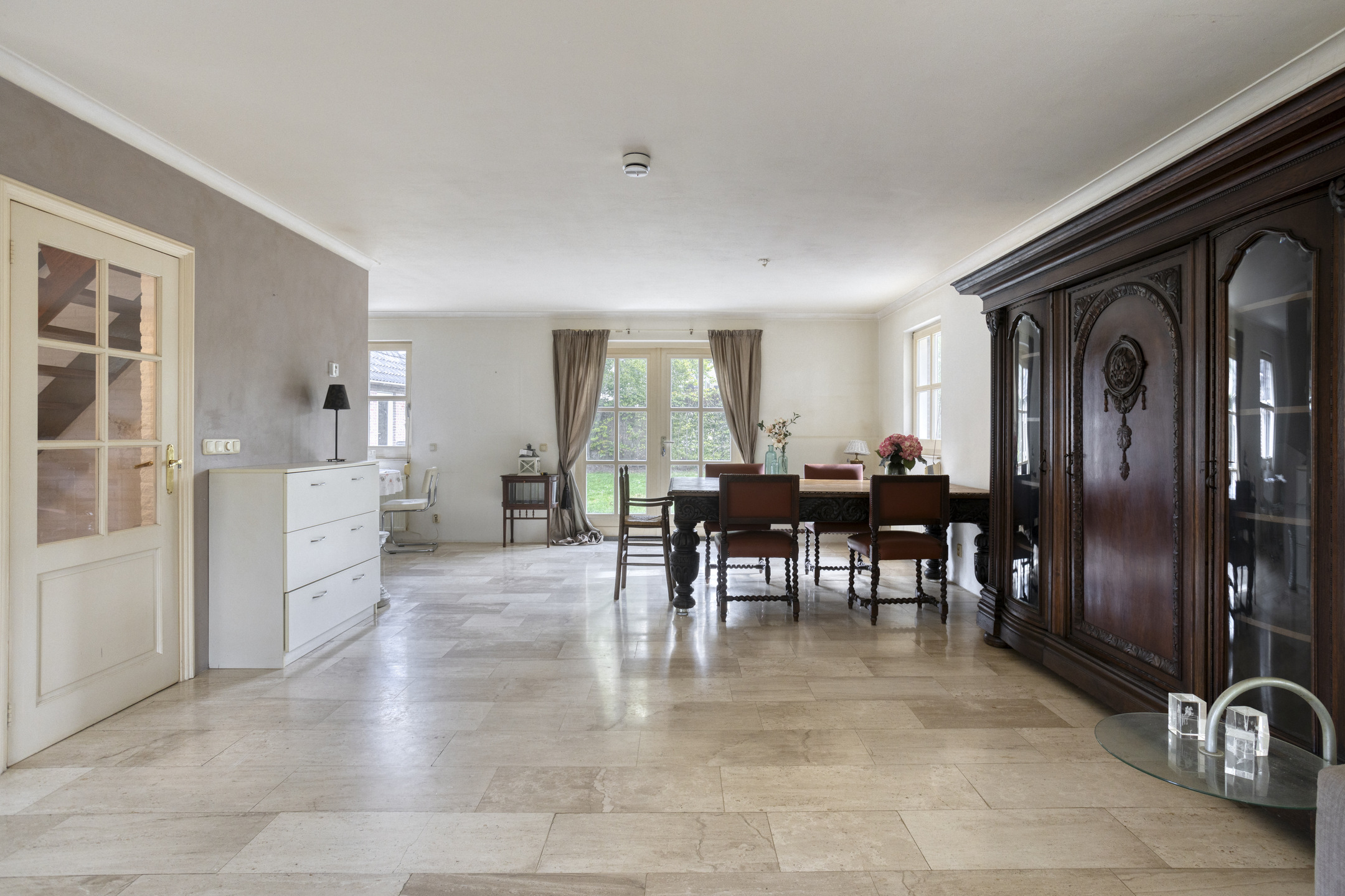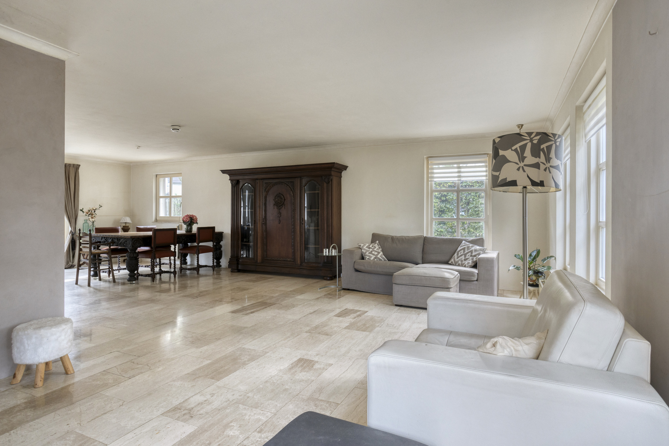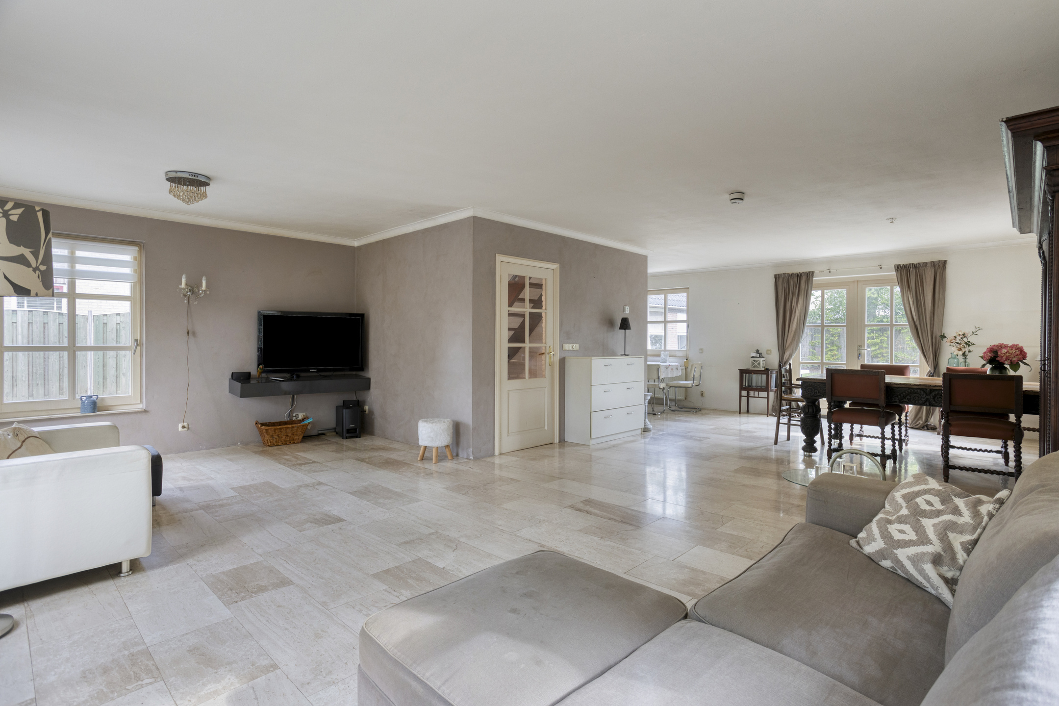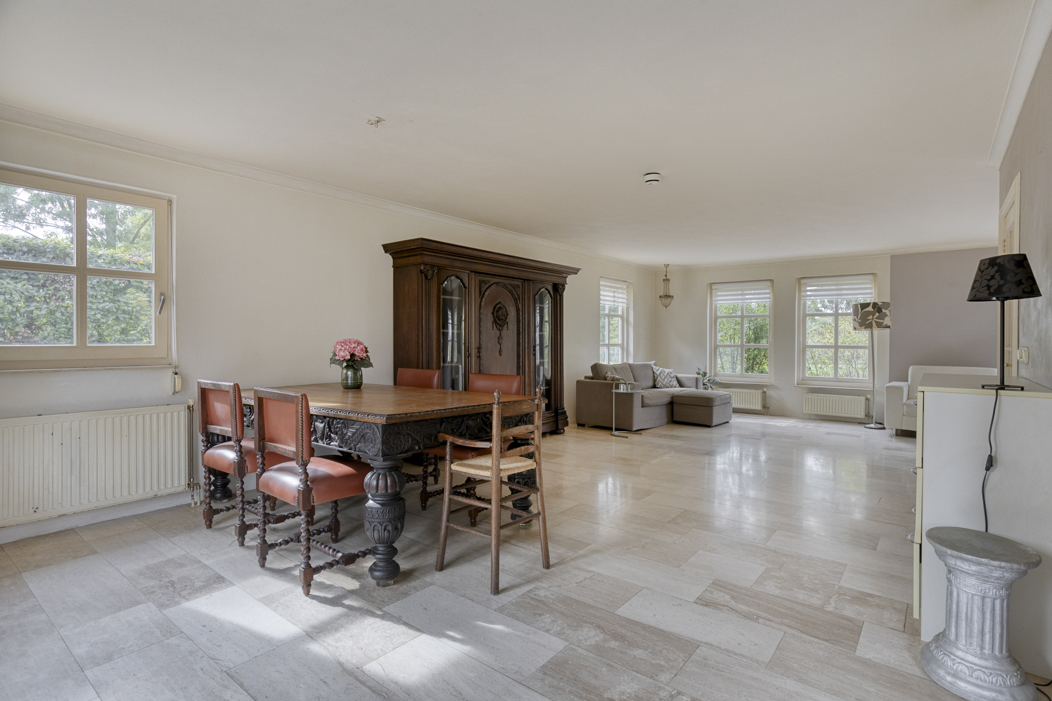 De woonkamer is royaal en opvallend licht dankzij de vele ramen rondom. Aan de voorzijde kun je een comfortabele zithoek creëren met uitzicht op het groene plantsoen. Aan de achterzijde is er ruimte voor een gezellige zithoek, waarbij de openslaande deuren toegang geven tot de tuin. De lichte marmeren vloer die door de hele begane grond ligt, zorgt voor een rustige en uniforme uitstraling.