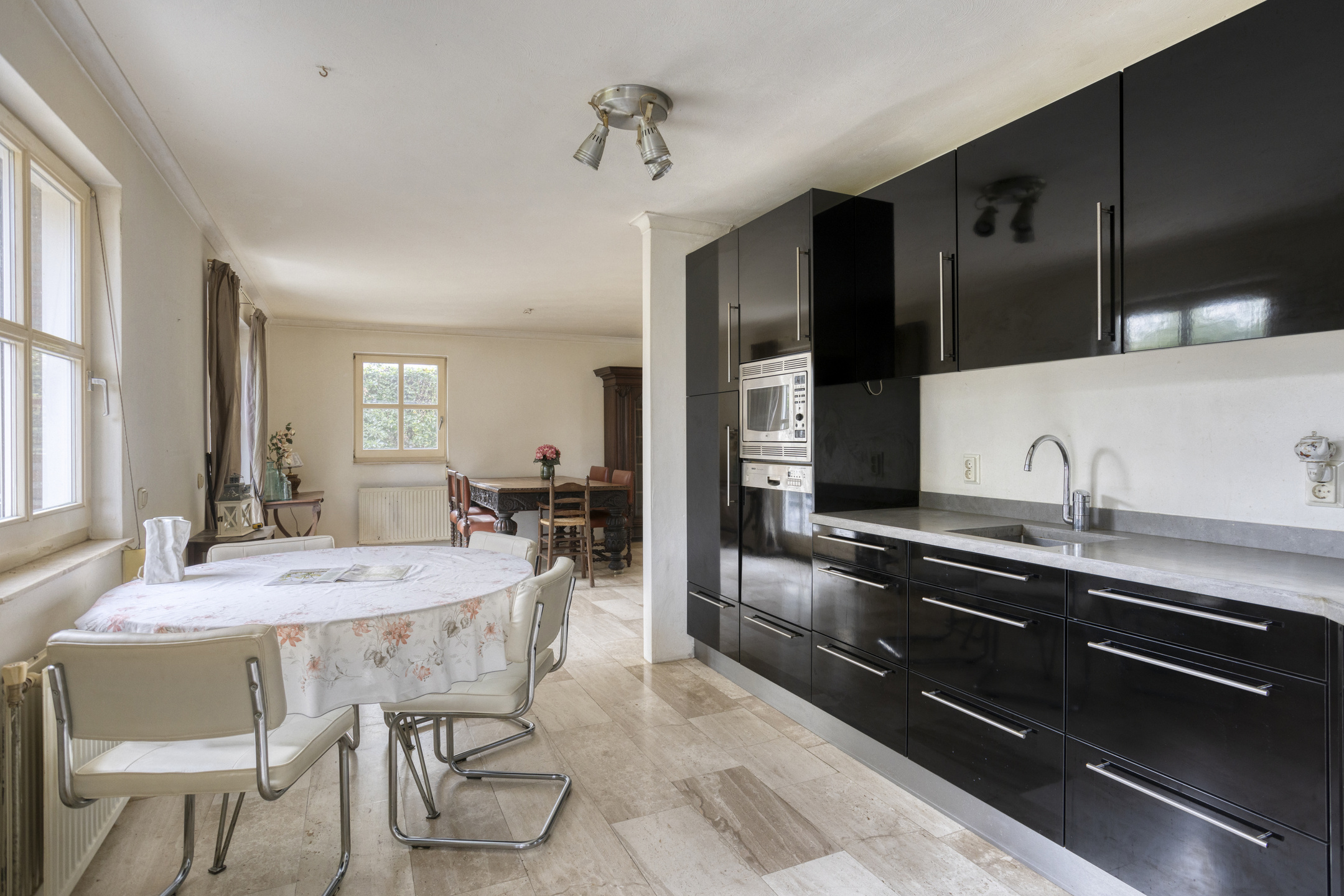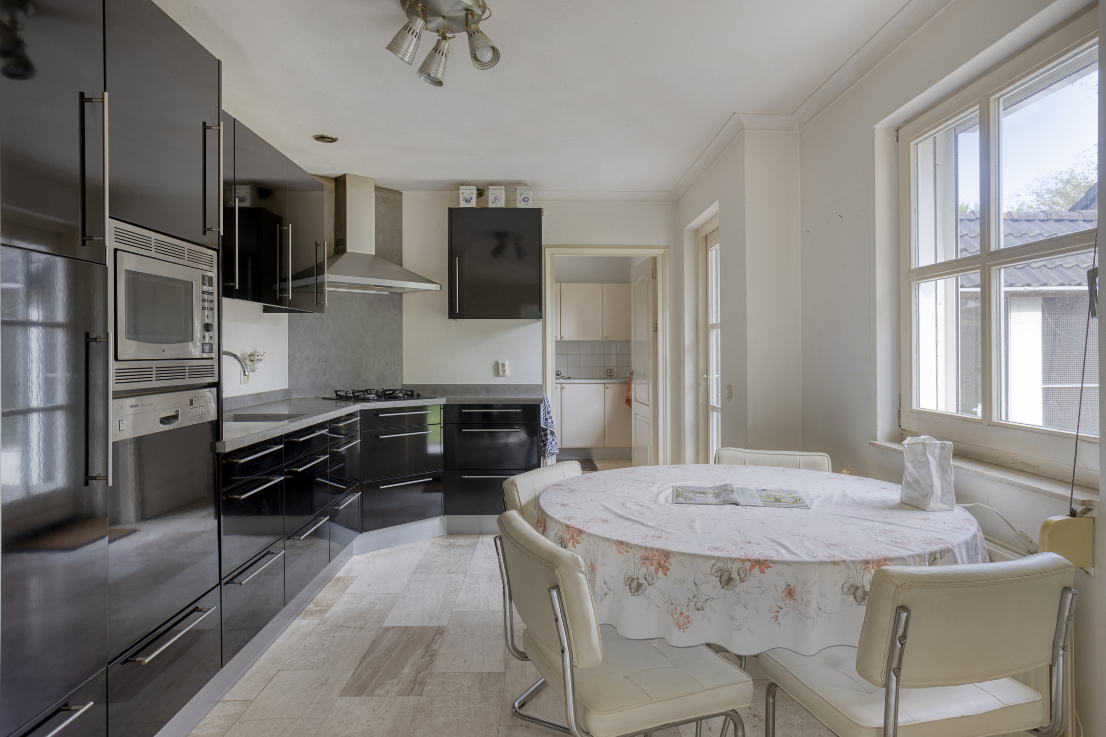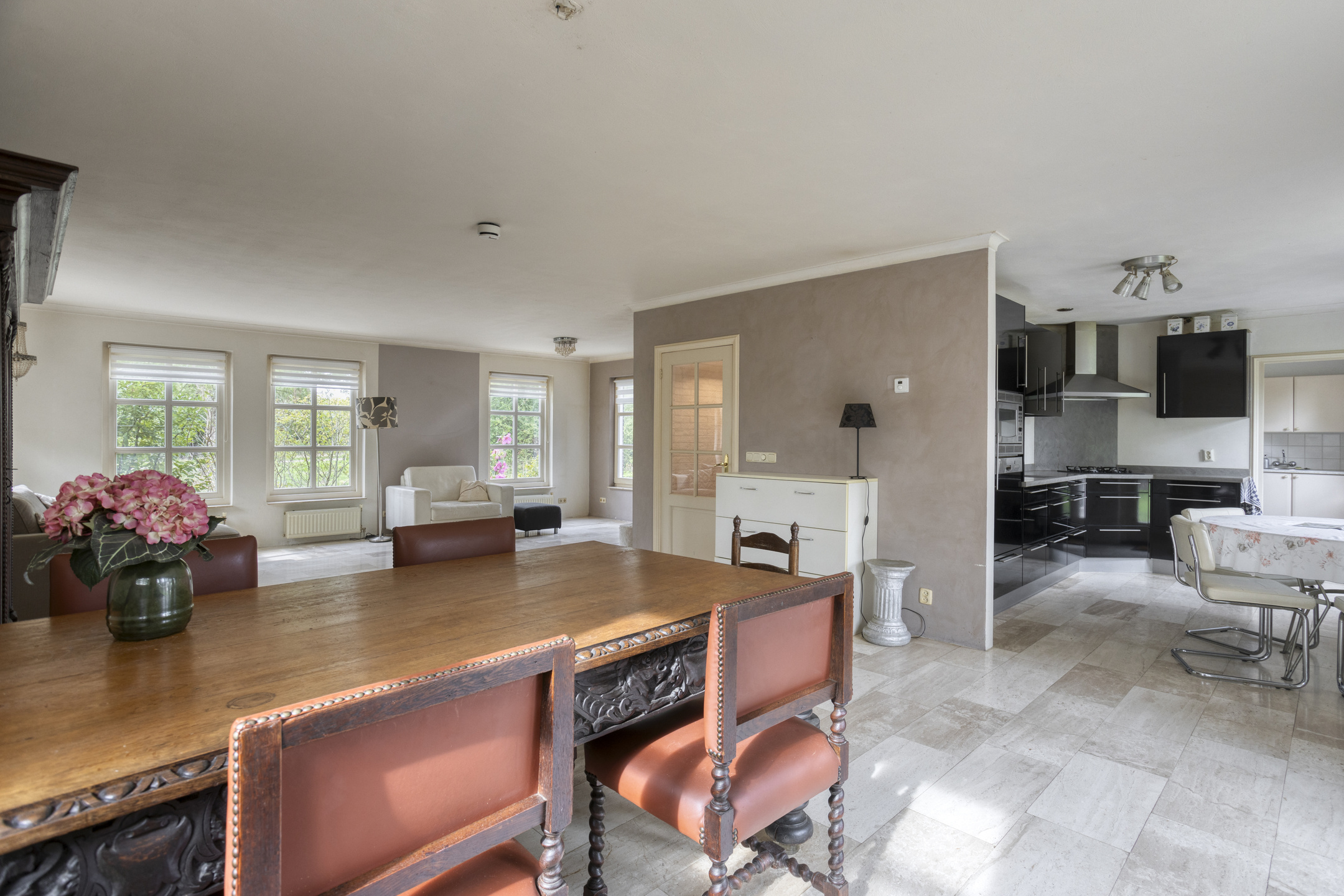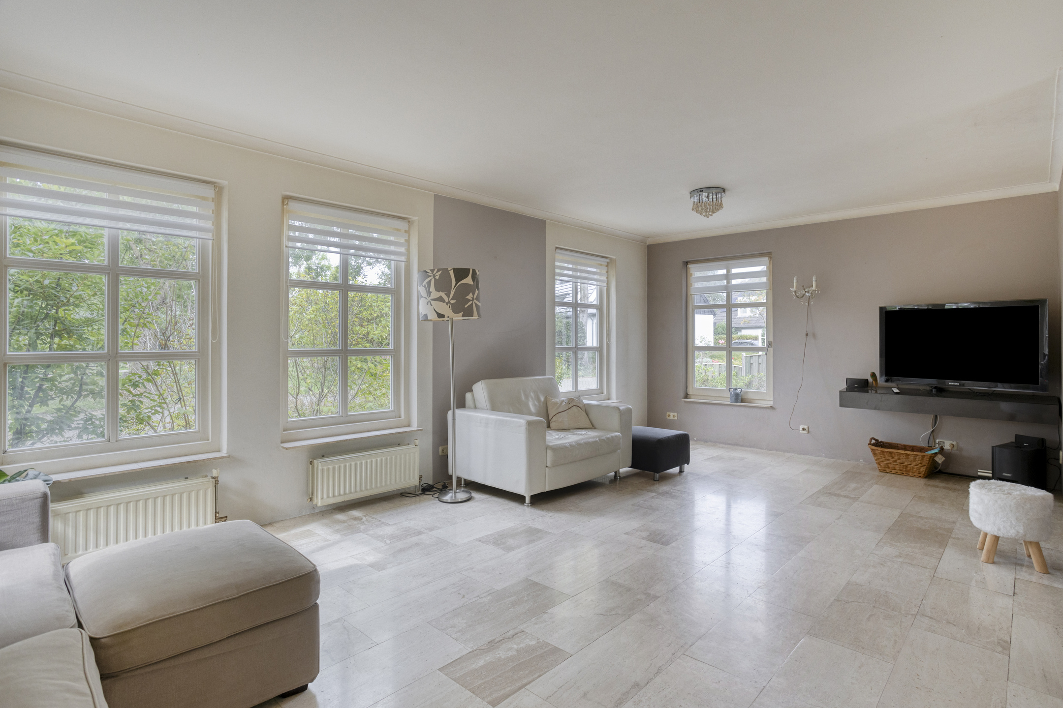 De woonkamer is royaal en opvallend licht dankzij de vele ramen rondom. Aan de voorzijde kun je een comfortabele zithoek creëren met uitzicht op het groene plantsoen. Aan de achterzijde is er ruimte voor een gezellige zithoek, waarbij de openslaande deuren toegang geven tot de tuin. De lichte marmeren vloer die door de hele begane grond ligt, zorgt voor een rustige en uniforme uitstraling.