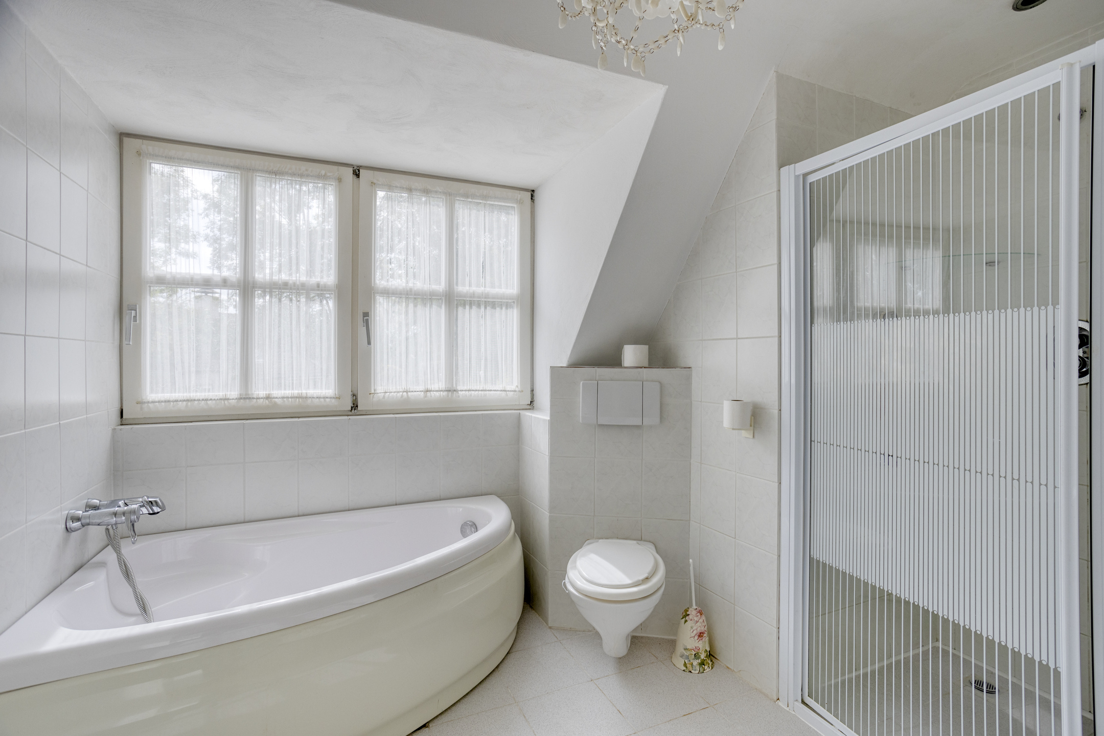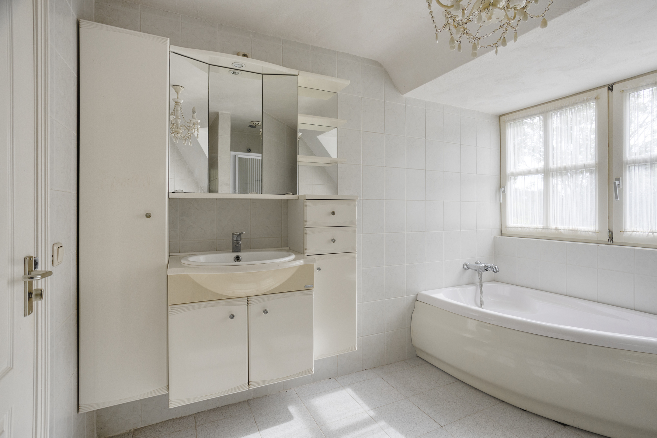 De badkamer is volledig betegeld in lichte tinten en uitgerust met een wastafel met meubel, een ligbad, een inloopdouche en een toilet. Dankzij de twee draaikiepramen is er veel daglicht en natuurlijke ventilatie. Je kunt de badkamer zowel vanuit de overloop als rechtstreeks vanuit de hoofdslaapkamer bereiken.