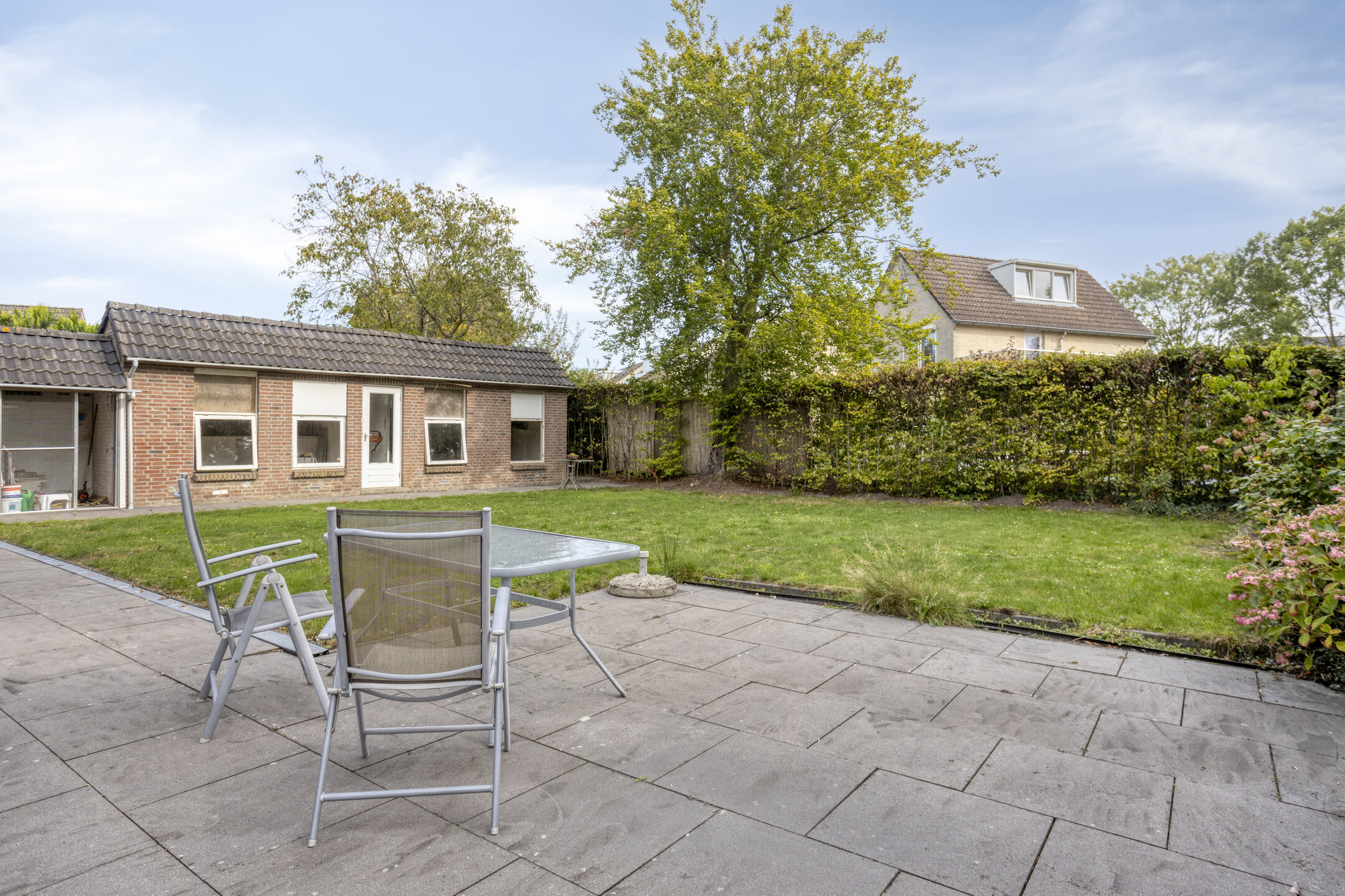 De achtertuin bereik je via de openslaande deuren in de woonkamer, de loopdeur in de keuken of de achterom naast de woning. De tuin heeft een royaal terras, een gazon en een bijgebouw dat je kunt gebruiken als berging of hobbyruimte. Hier geniet je in alle rust van een groene omgeving.