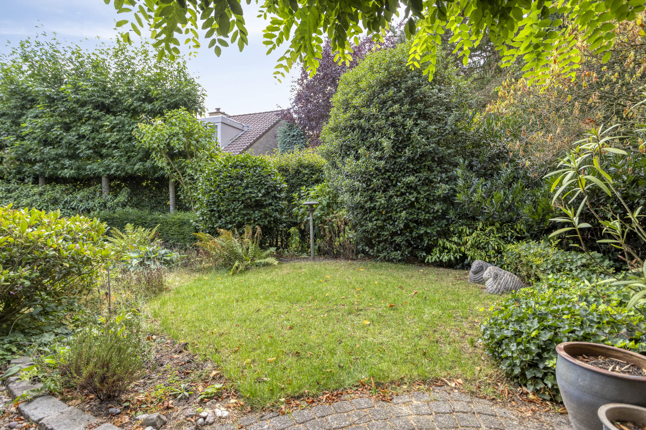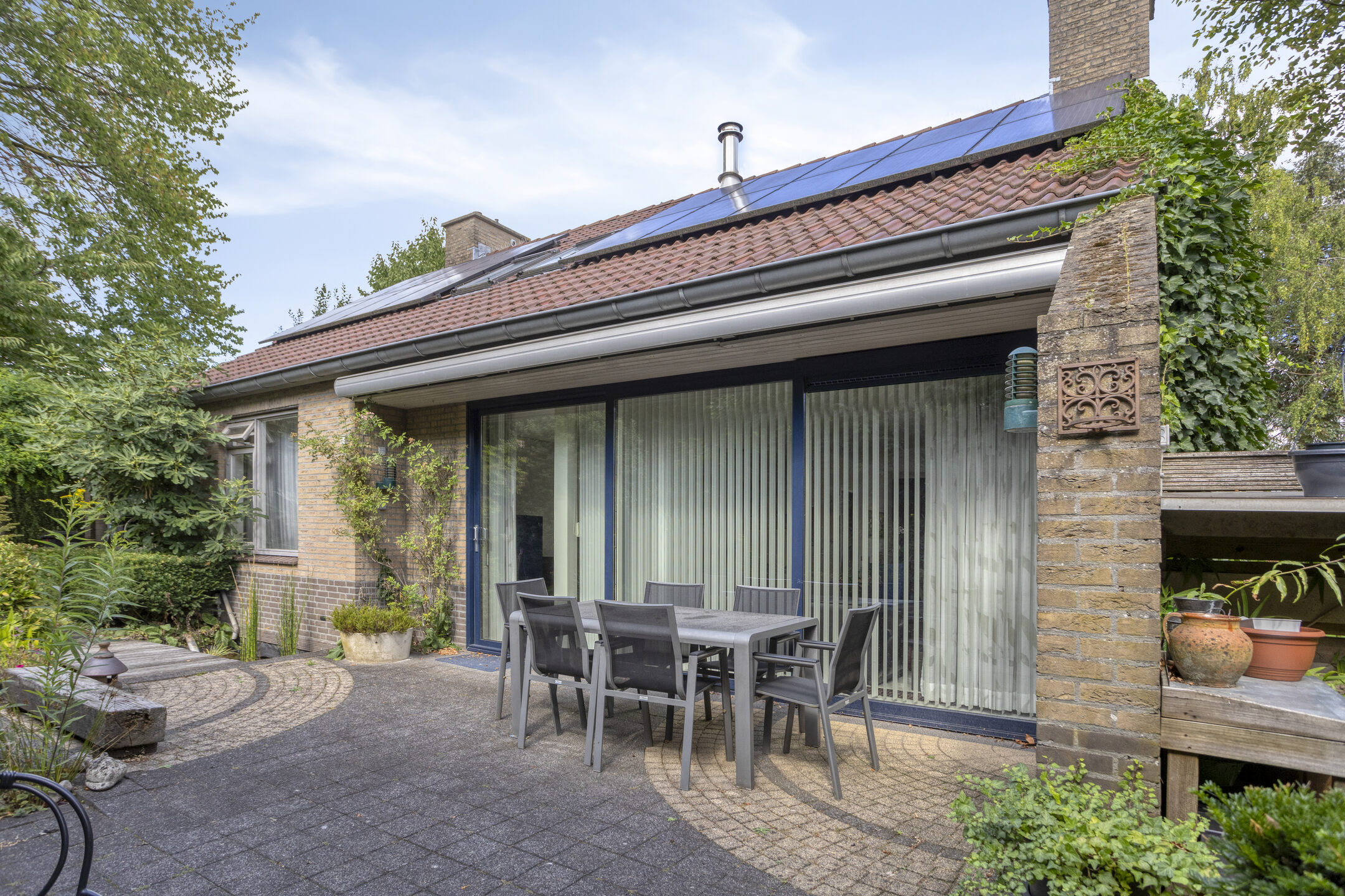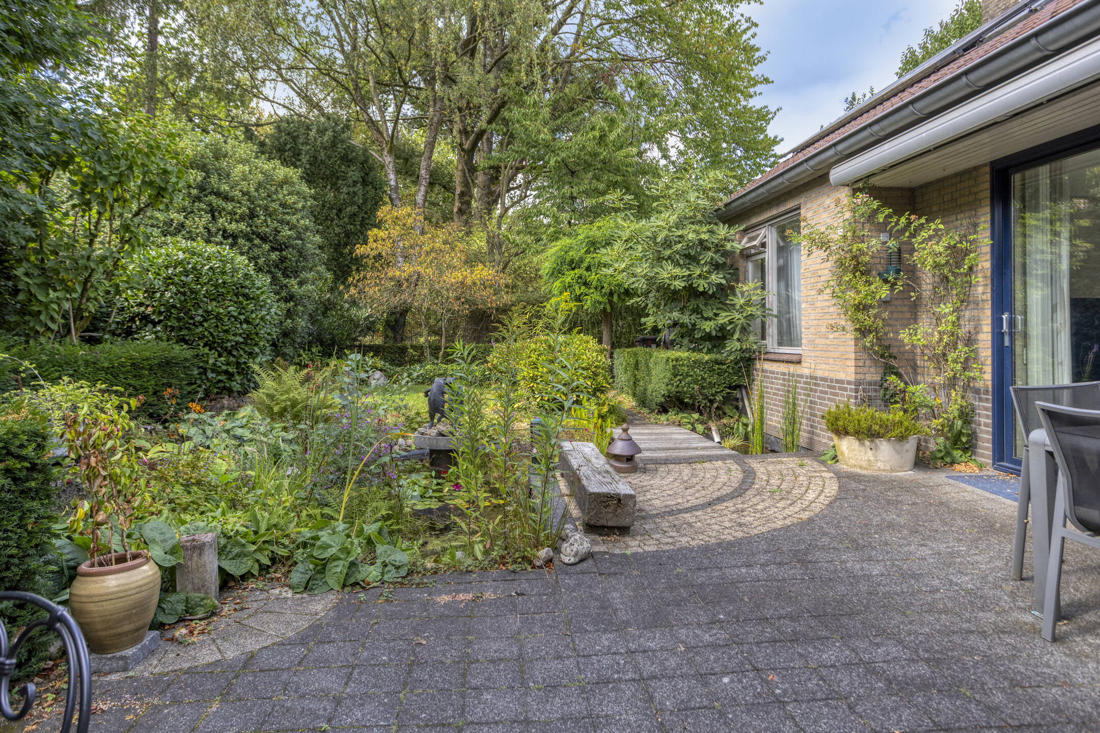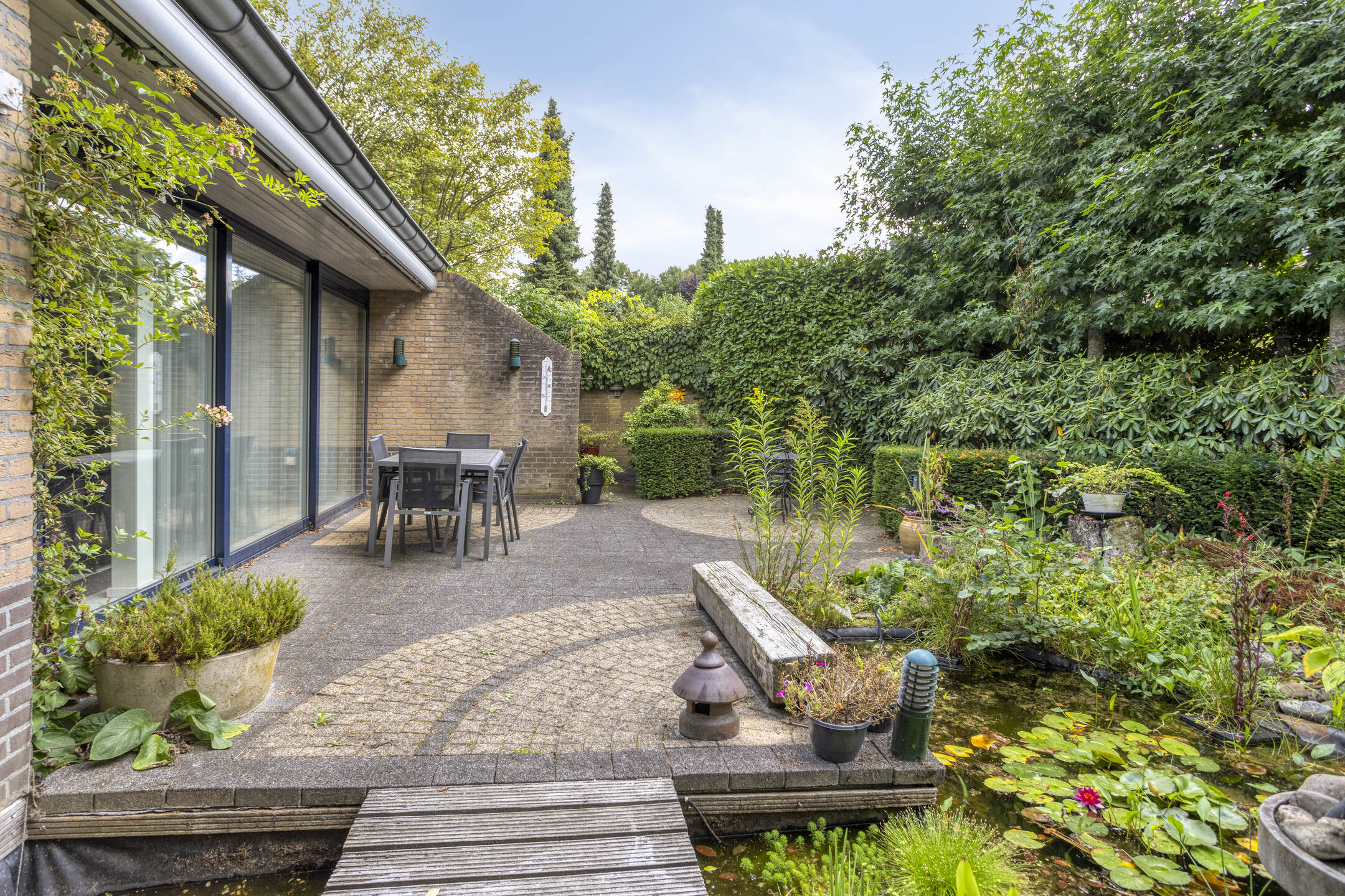 De woning beschikt over een heerlijk verzorgde tuin, bereikbaar via de grote schuifpui in de woonkamer. Zodra je naar buiten stapt, kom je op een royaal betegeld terras met zonnescherm, ideaal om lange zomeravonden door te brengen. Verder vind je in de tuin een sfeervol vijvertje met loopbruggetje, diverse groene beplanting en een fraai gazon. De tuin is bovendien praktisch ingedeeld: aan de zijkant bevindt zich een achterom, waardoor de tuin gemakkelijk bereikbaar is. Vanuit de tuin heb je ook een loopdeur naar de garage.