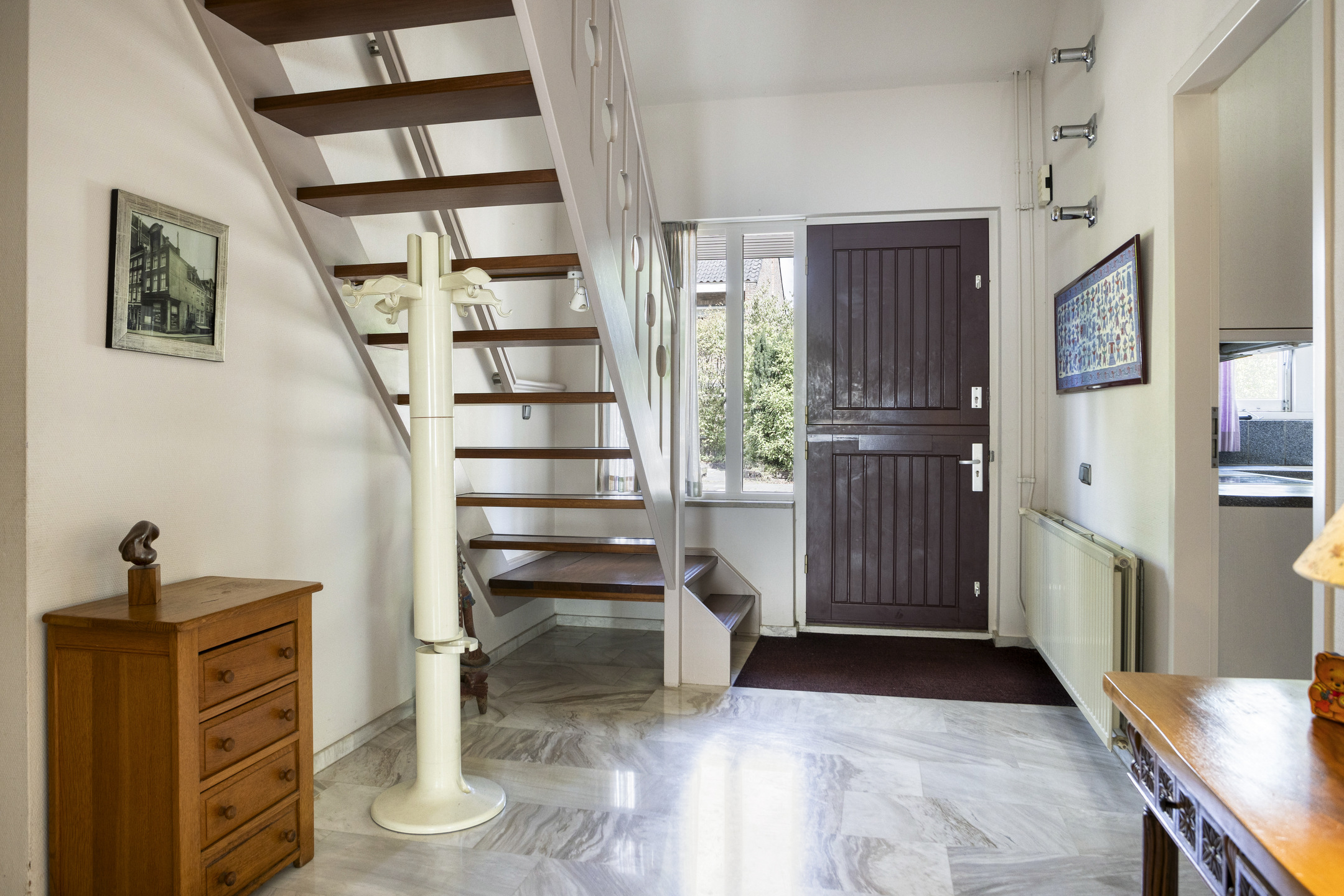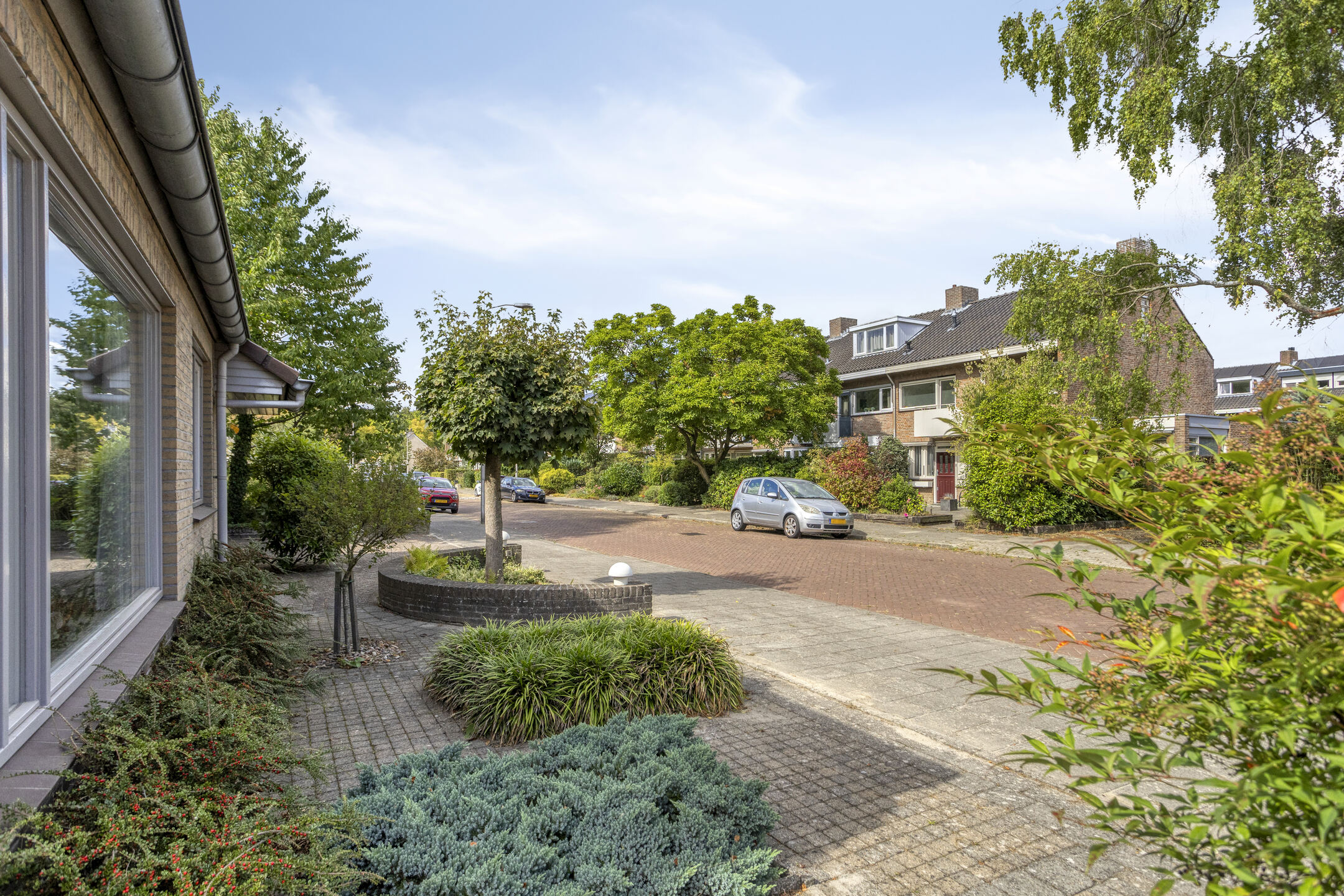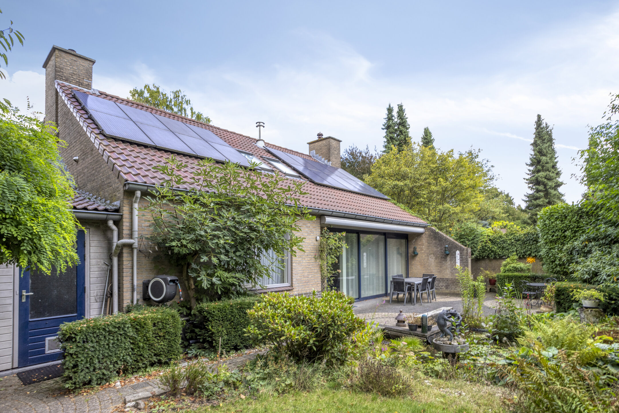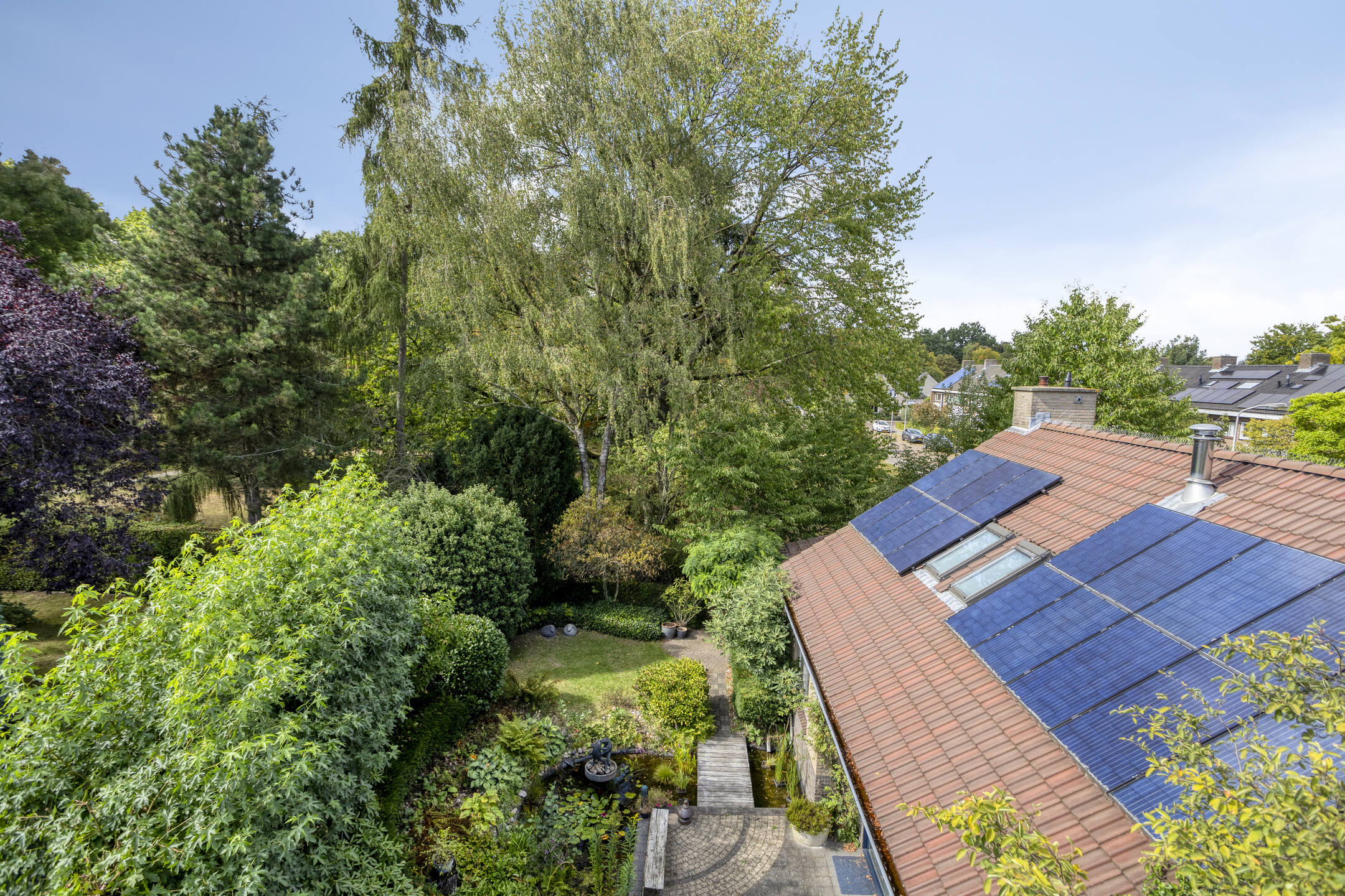 De woning beschikt over een heerlijk verzorgde tuin, bereikbaar via de grote schuifpui in de woonkamer. Zodra je naar buiten stapt, kom je op een royaal betegeld terras met zonnescherm, ideaal om lange zomeravonden door te brengen. Verder vind je in de tuin een sfeervol vijvertje met loopbruggetje, diverse groene beplanting en een fraai gazon. De tuin is bovendien praktisch ingedeeld: aan de zijkant bevindt zich een achterom, waardoor de tuin gemakkelijk bereikbaar is. Vanuit de tuin heb je ook een loopdeur naar de garage.