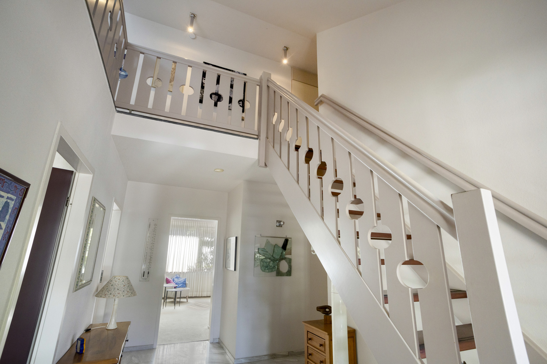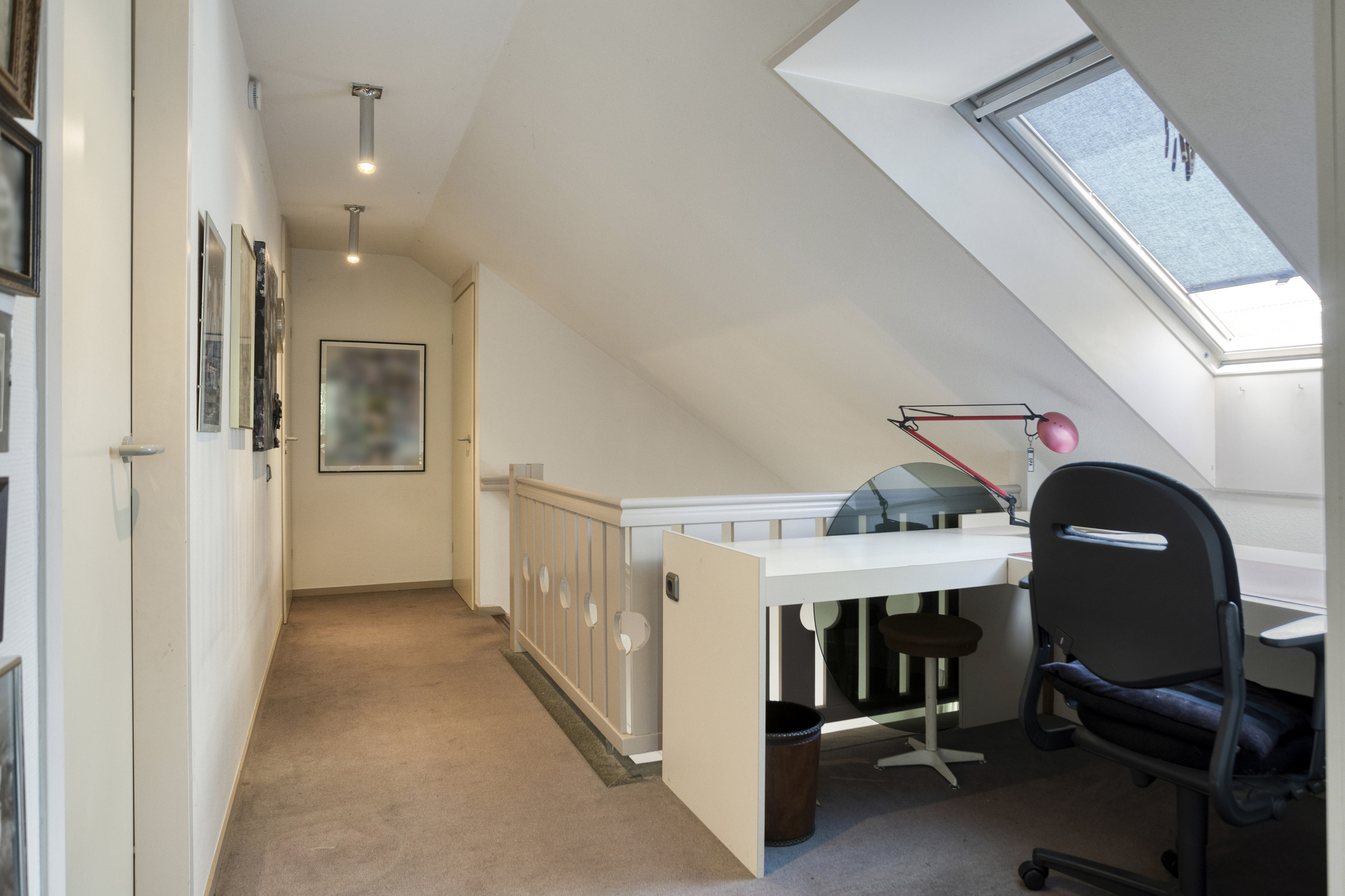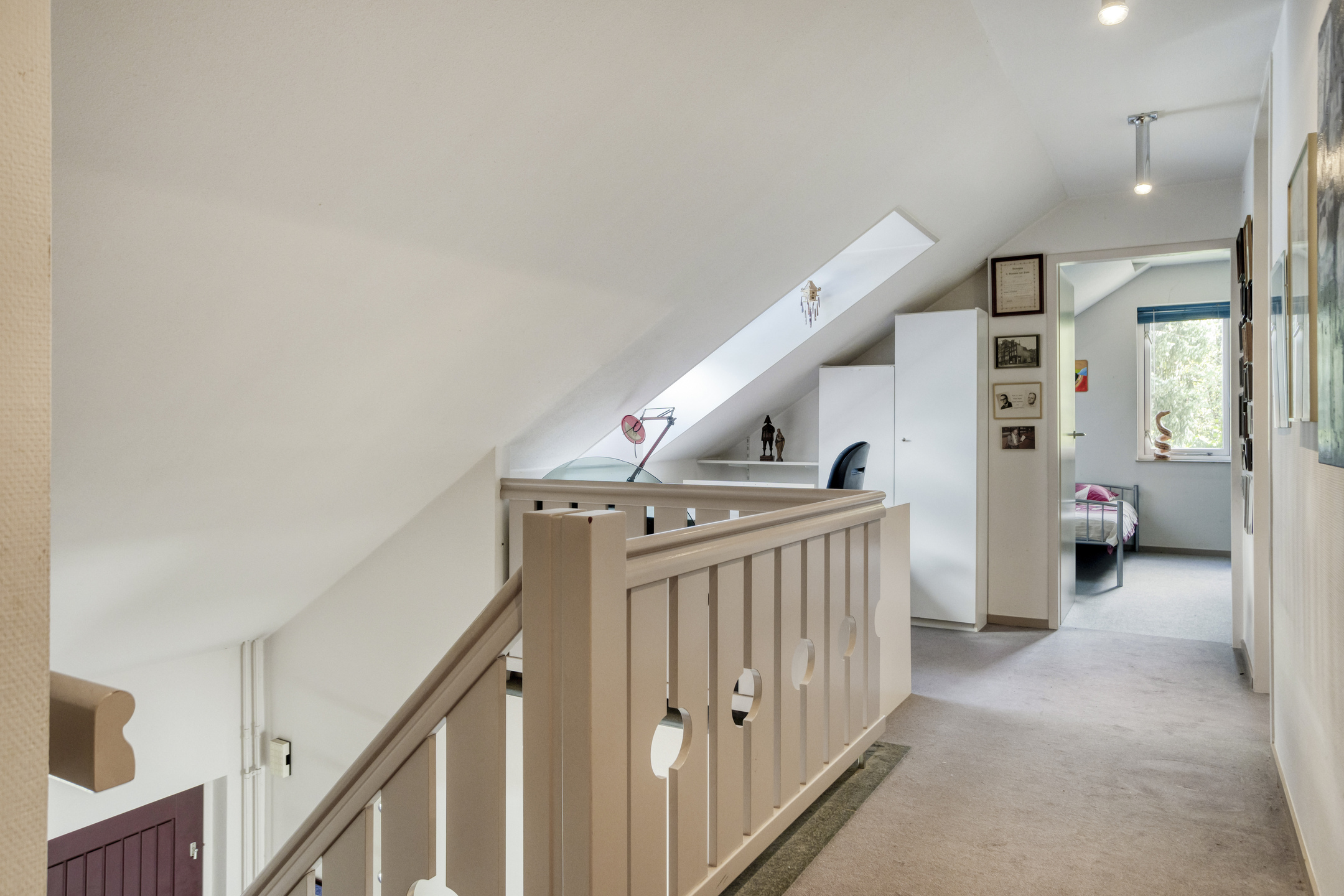 Via de trap in de hal bereik je de eerste verdieping. Hier kom je uit op een royale overloop, die dankzij een Velux-dakraam prettig veel licht ontvangt. Deze ruimte is groot genoeg om bijvoorbeeld in te richten als werkhoek of studieplek met bureau.
