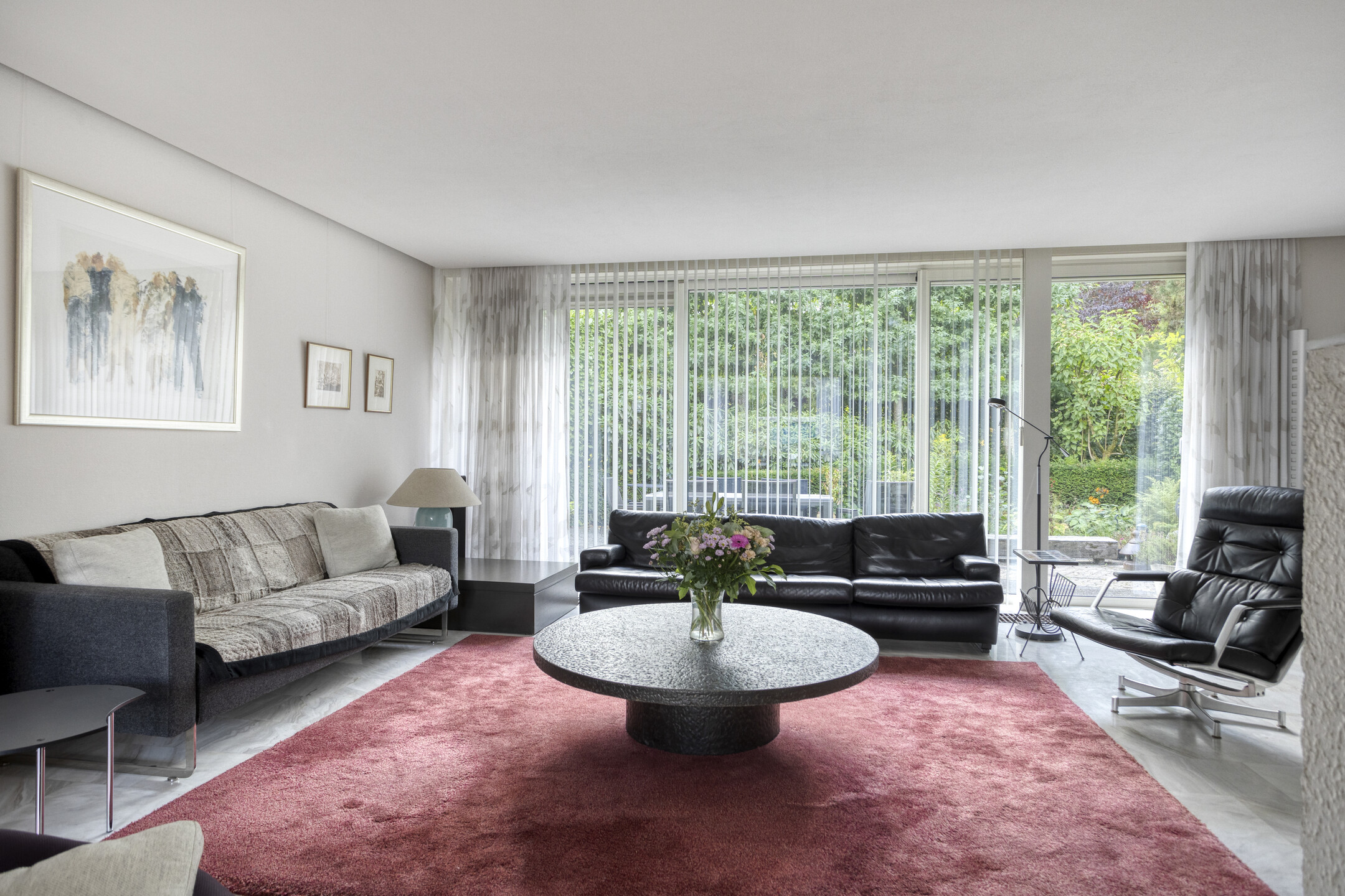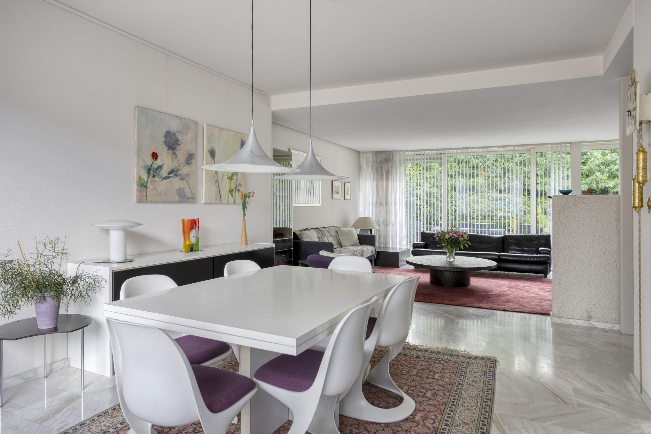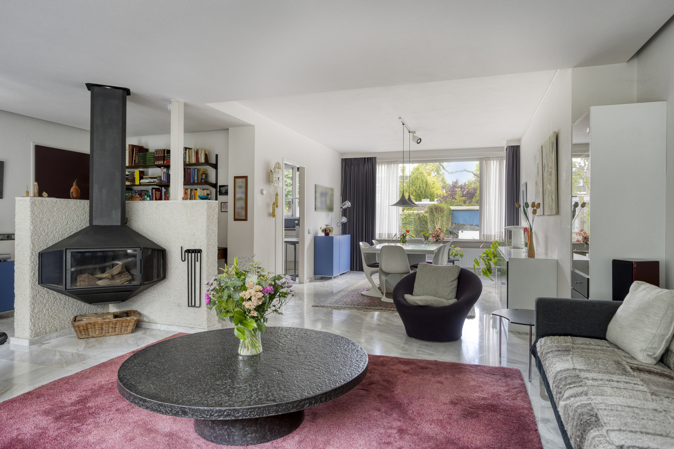 De woonkamer is royaal van opzet en straalt direct een warme sfeer uit. Aan de achterzijde zorgen de grote glazen pui en schuifdeuren voor een overvloed aan daglicht. Deze pui kan volledig open, waardoor binnen en buiten moeiteloos in elkaar overlopen. Er is volop ruimte voor een royale zithoek rondom de sfeervolle open haard, terwijl een knus hoekje zich perfect leent als lees- of werkruimte. Aan de voorzijde bevindt zich de lichte eethoek, met een grote raampartij en direct toegang tot de keuken.