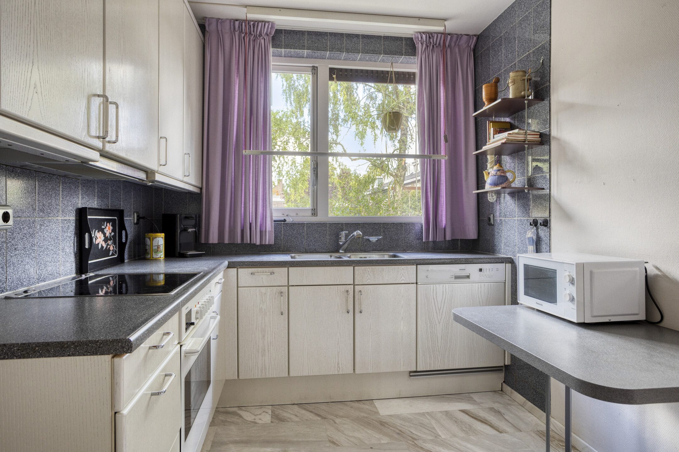De keuken is ingericht in een praktische L-opstelling en beschikt over een raam aan de voorzijde, wat zorgt voor een prettige lichtinval tijdens het koken. Er is daarnaast voldoende ruimte voor een servieskast of extra opbergmogelijkheden.