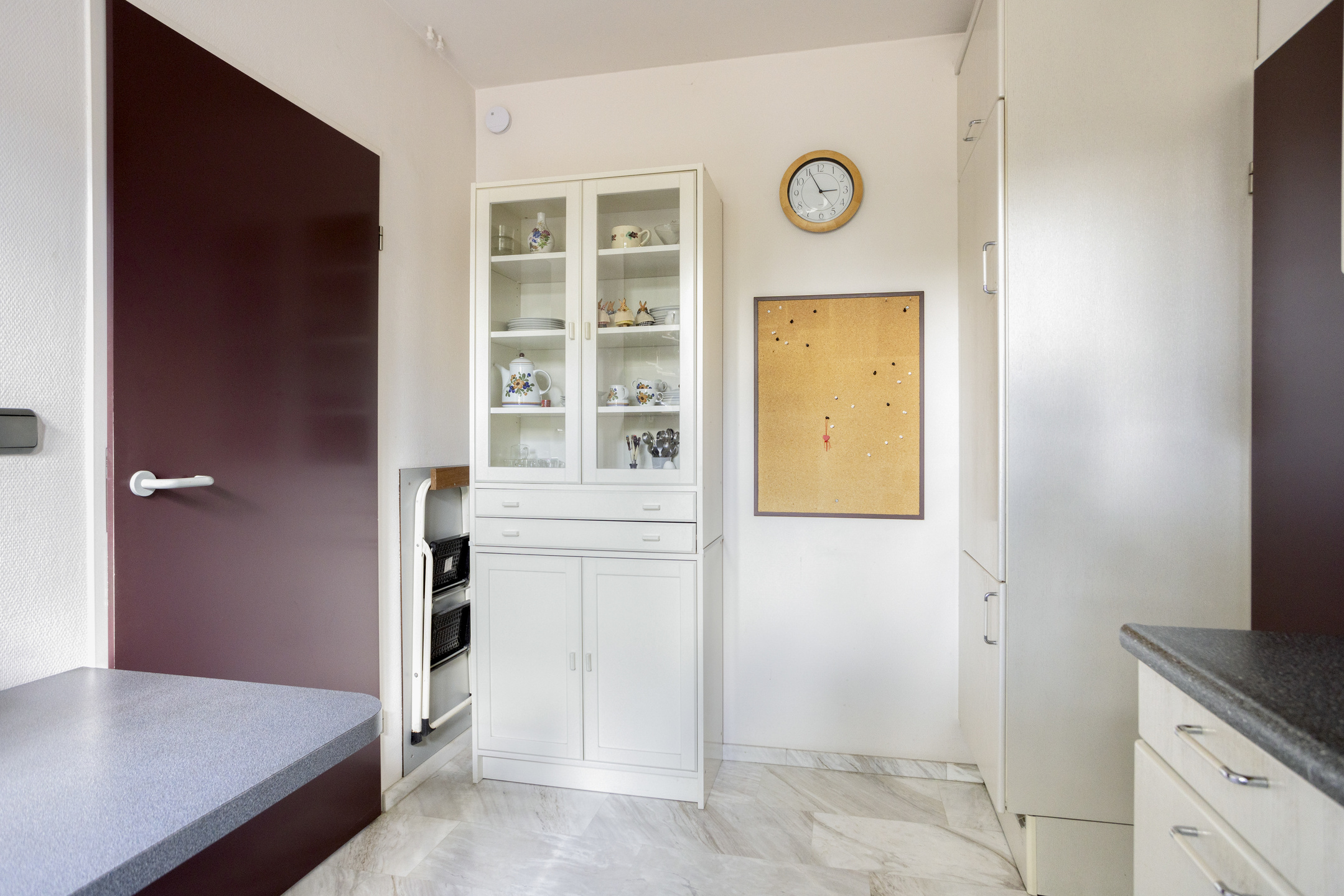 De bijkeuken is uiterst praktisch ingedeeld, met volop bergruimte. Hier bevinden zich tevens de meterkast en de toegang tot de inpandige garage.