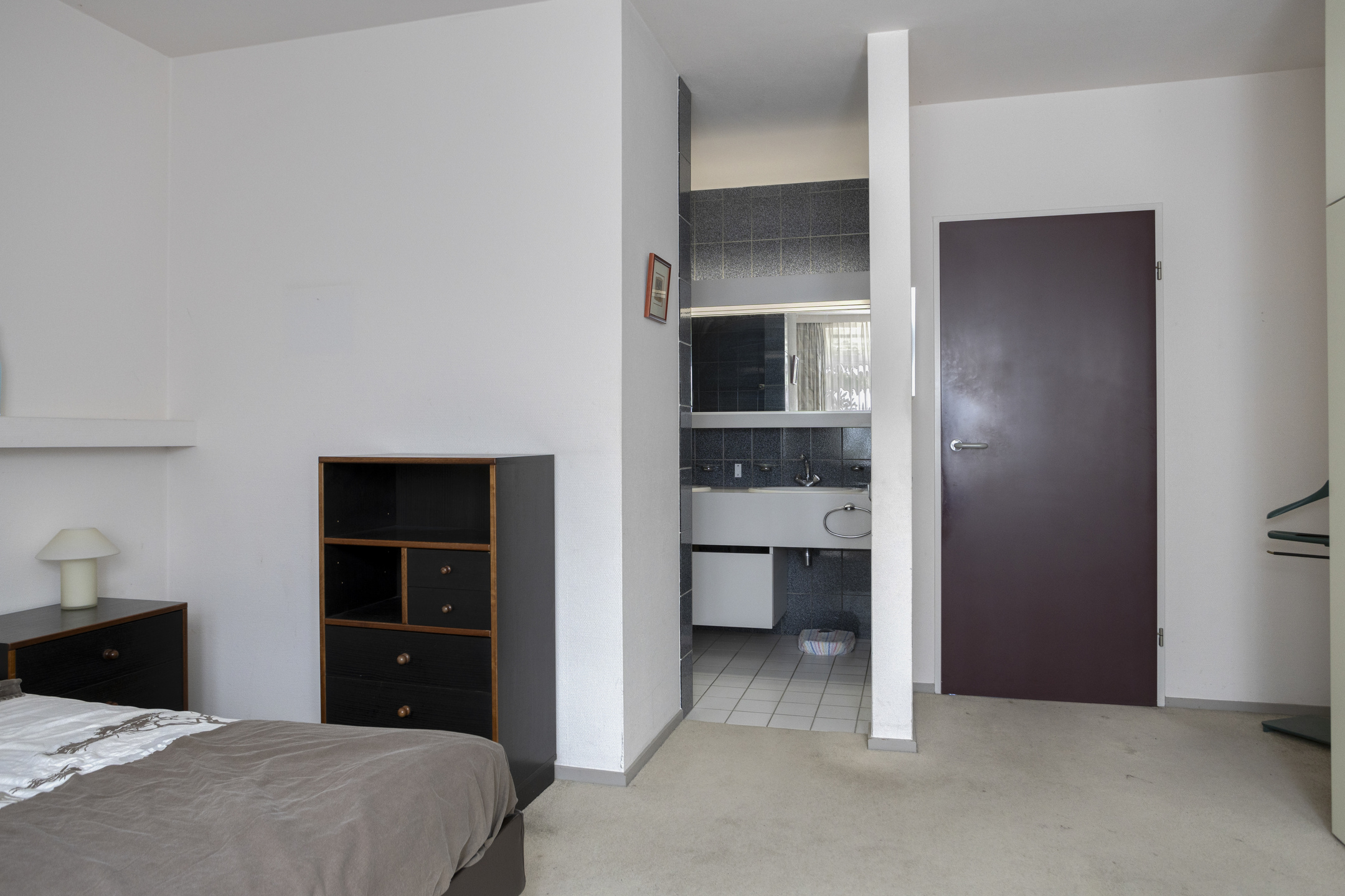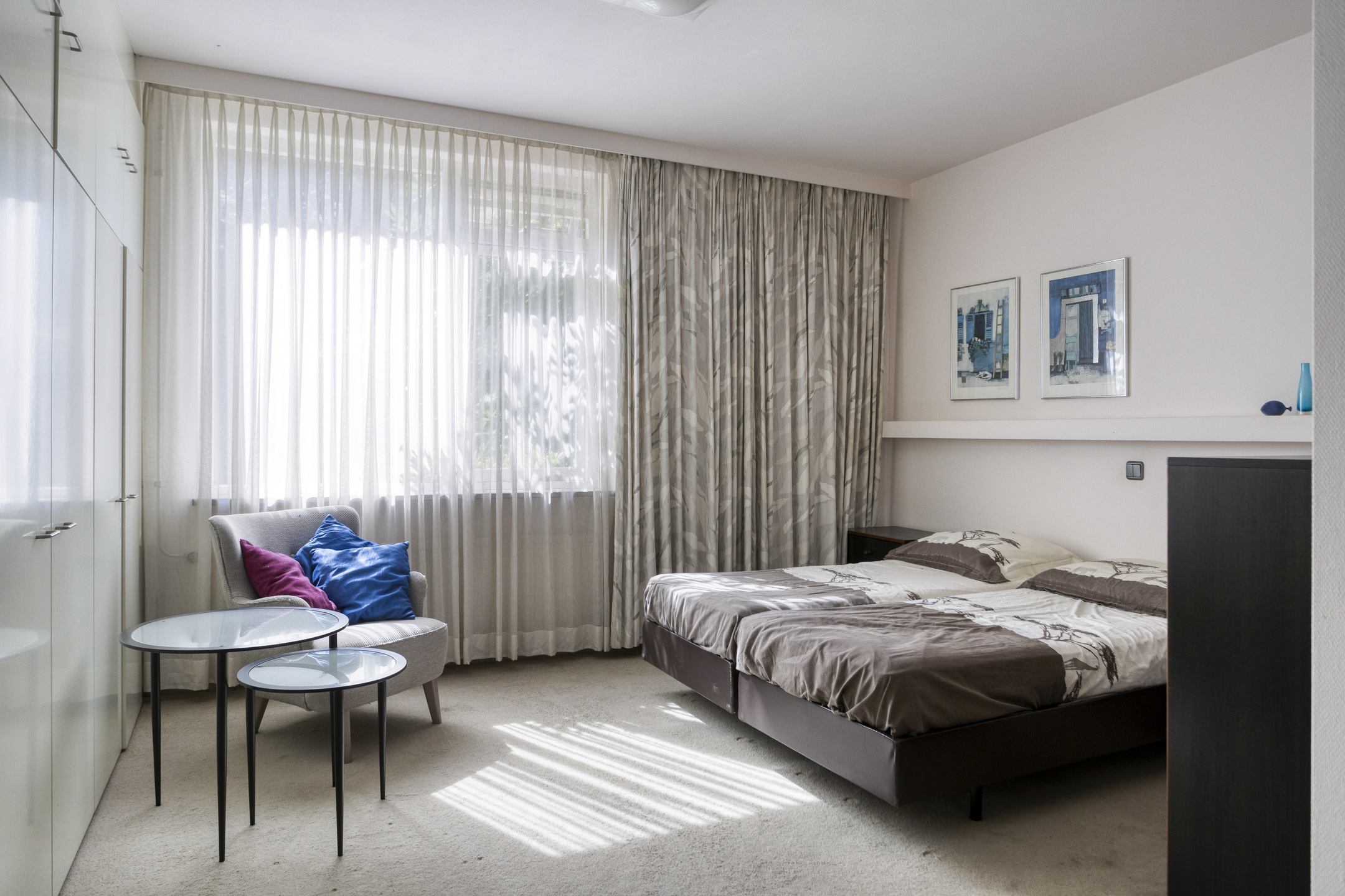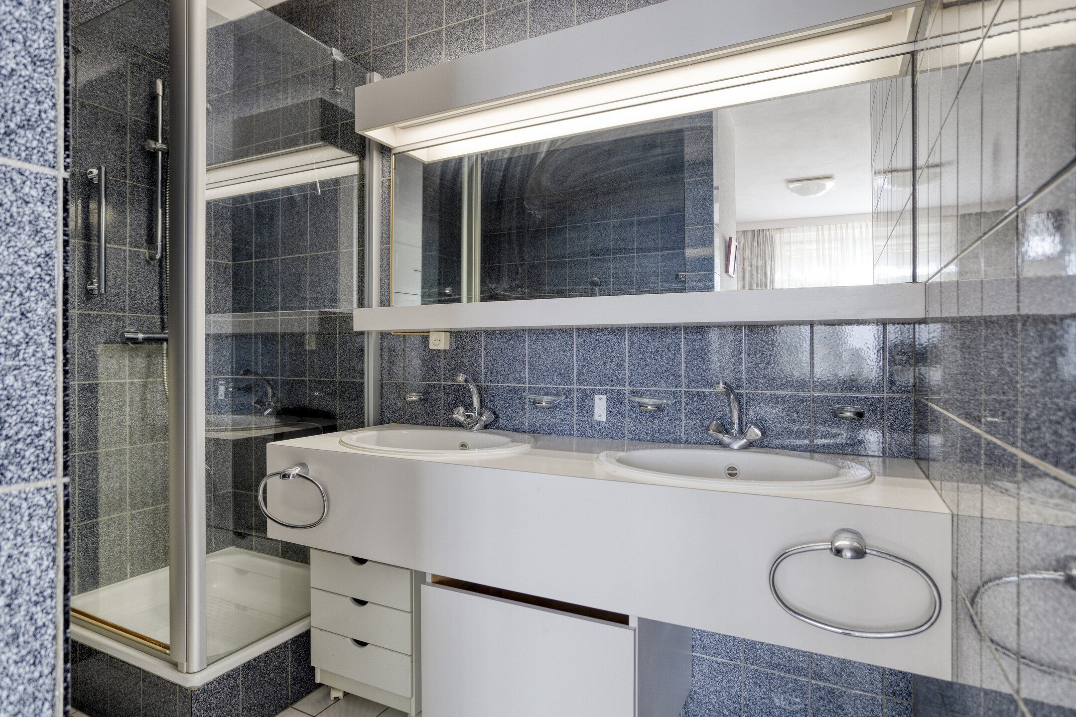 Op de begane grond bevindt zich tevens een zeer comfortabele slaapkamer met badkamer en suite. De slaapkamer is ruim, voorzien van vaste kasten en geniet van veel lichtinval dankzij de ligging aan de achterzijde van de woning. De aangrenzende badkamer is stijlvol en compleet uitgerust met een dubbele wastafel, een douche en een ligbad. Ook deze ruimte is volledig betegeld