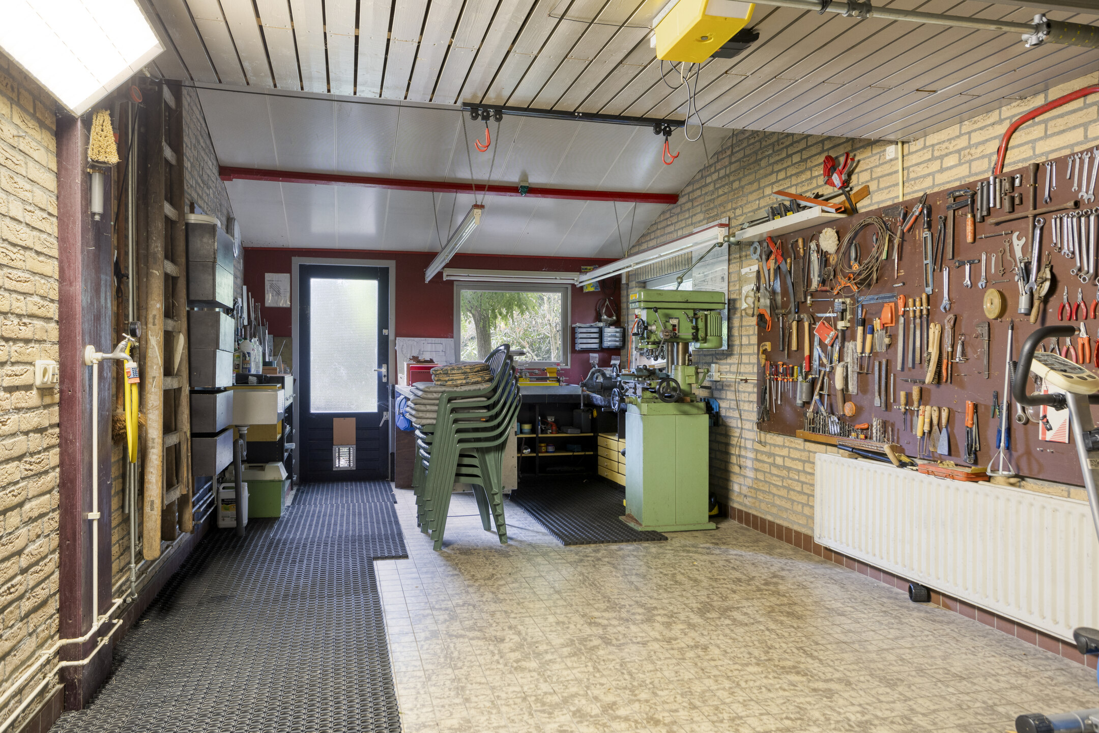 De garage is zeer ruim en voorzien van een elektrische roldeur, waardoor je met gemak een auto binnen kunt parkeren. Daarnaast is er volop plek om fietsen te stallen en tuingereedschap of andere spullen netjes op te bergen. Ook is de garage voorzien van een vliering waardoor je extra opbergruimte hebt. Omdat de garage zowel vanuit de tuin als inpandig bereikbaar is, vormt deze een praktisch verlengstuk van de woning.