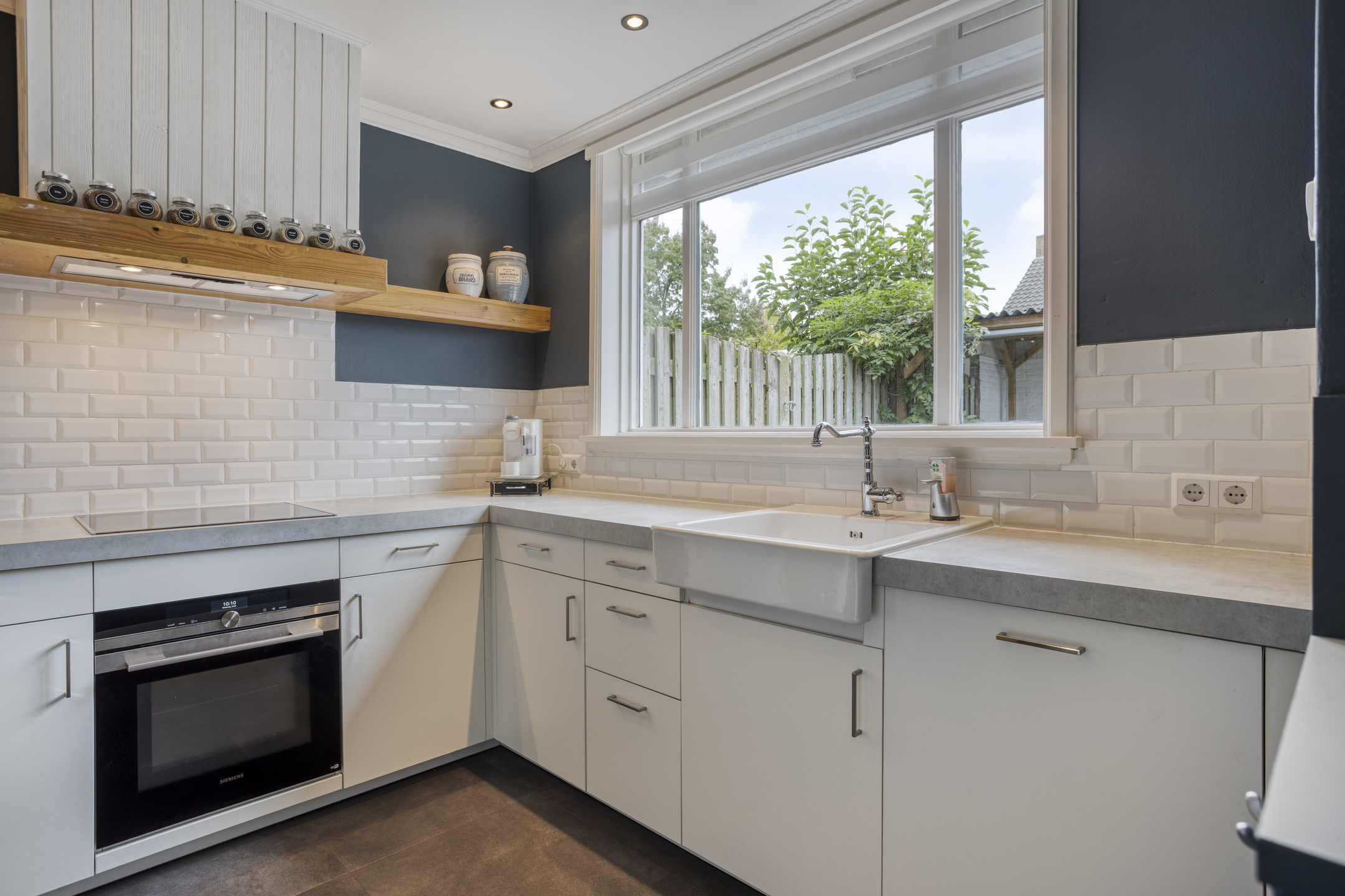 Nette keuken met inbouwapparatuur en openslaande deuren naar de tuin